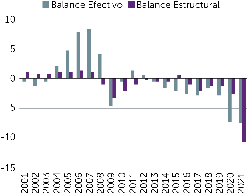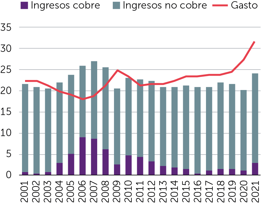 La política fiscal en Chile desde el año 2001 se guía por una meta de balance cíclicamente ajustado, también comúnmente llamado balance estructural. Esta ha permitido disminuir la volatilidad fiscal y macroeconómica, contribuyendo a minimizar el impacto del ciclo económico y del precio del cobre en el gasto público, y generar ahorros para enfrentar crisis como las ocurridas en 2009 y la recientemente provocada por la pandemia del Covid-19. La última revisión integral al cálculo del balance estructural se realizó en 2010 por un comité asesor[16]. Desde entonces, existe amplio consenso respecto a la necesidad de hacer mejoras a algunas áreas de la regla fiscal, las cuales han sido abordadas por la Dipres, el Consejo Fiscal Asesor, el Consejo Fiscal Autónomo (CFA), el FMI, el BID, además de diversos/as analistas nacionales y extranjeros.