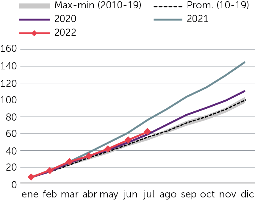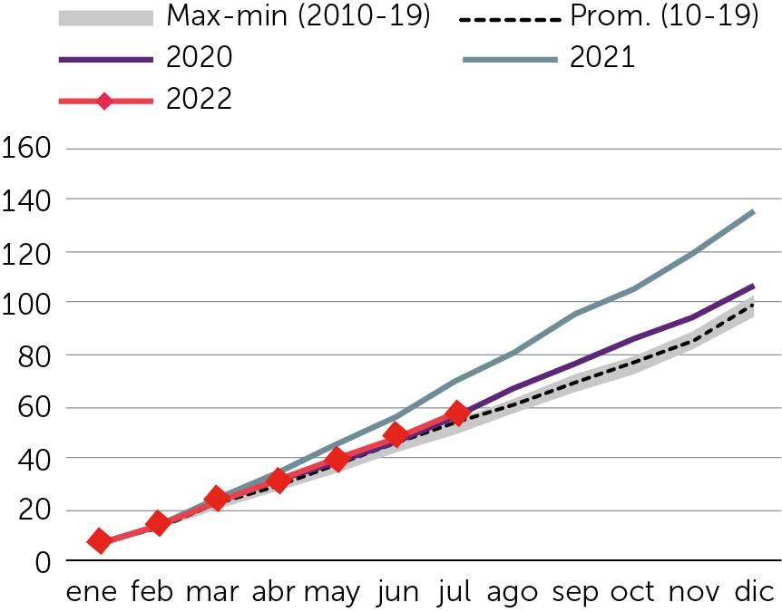 Los ingresos fiscales han sorprendido al alza respecto de lo proyectado al momento de la elaboración de la Ley de Presupuestos 2022, producto de una Operación Renta más dinámica que lo previsto y una demanda interna que se ha desacelerado más lento que lo anticipado. Los ingresos del Gobierno Central acumulados de enero a julio de este año registraron un crecimiento real anual de 29,3%, incididos principalmente por los ingresos tributarios netos (31,7% a/a real), que, a su vez, estuvieron influenciados por la mayor recaudación de impuesto a la renta (67,6% a/a real). Así, en lo que va del año, los ingresos recaudados por el Gobierno Central, como razón de lo estimado en la Ley de Presupuestos de 2022, se sitúan en un 80,1%, valor por sobre el comportamiento histórico de los ingresos (considerando el mismo periodo en años anteriores).