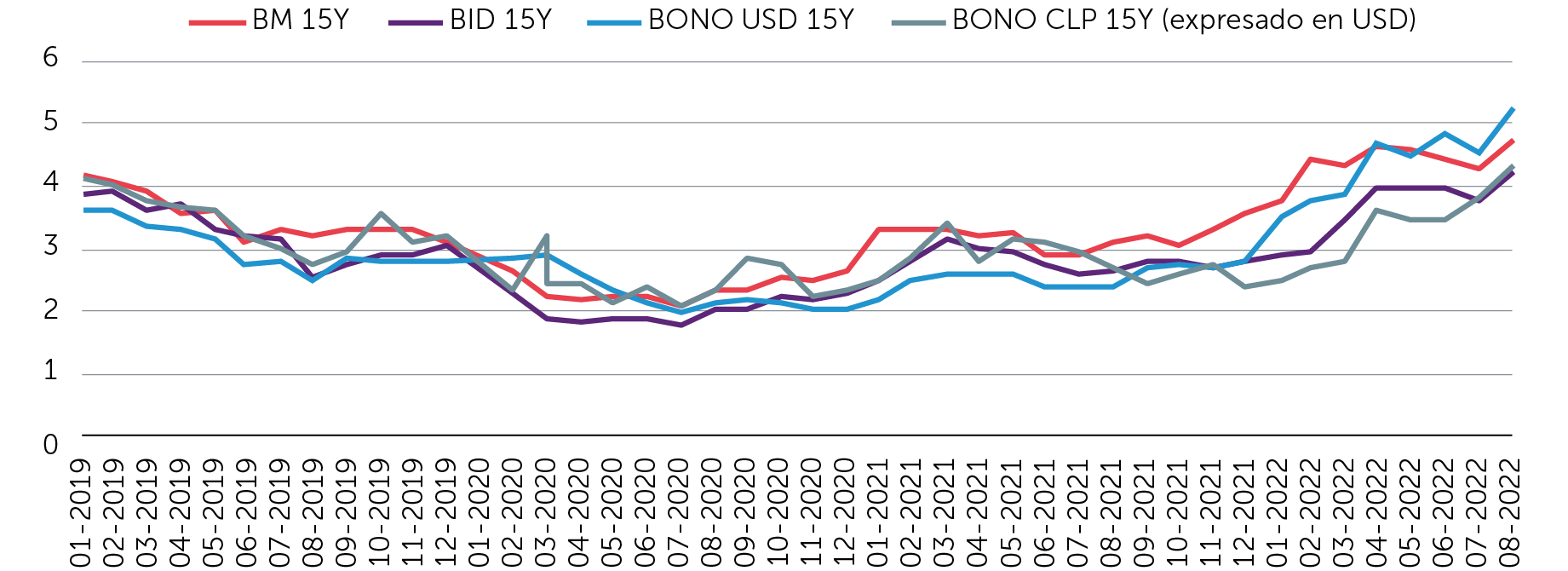 Costo histórico[18] Préstamos BM, BID v/s Bonos Soberanos (2019 – 2022 cierre agosto)