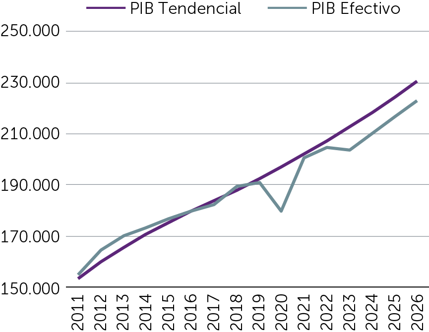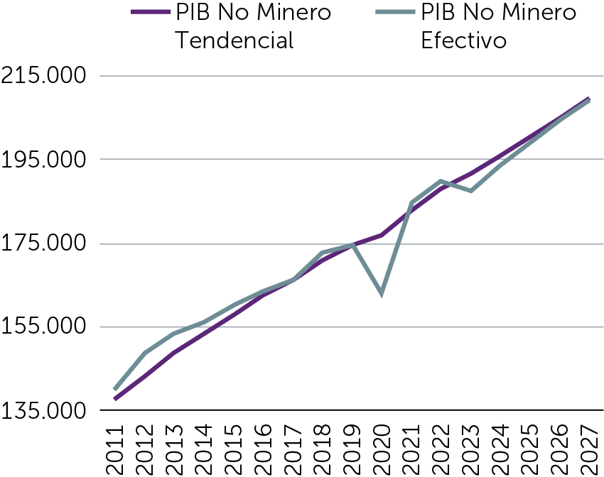 Con este resultado obtenido a partir de las proyecciones de las y los expertos y la nueva metodología, se logra contar con una mejor estimación del PIB No Minero Tendencial y de esta forma con una brecha de producto coherente con la situación actual de la economía (Gráfico II.9). Todo lo demás constante, un menor nivel de PIB No Minero Tendencial implica menores ingresos estructurales, con su consiguiente impacto en la consolidación del gasto, lo que permitiría un mejor balance efectivo con miras a cumplir las metas de balance estructural, evitando así la acumulación de déficits mayores en el mediano y largo plazo.