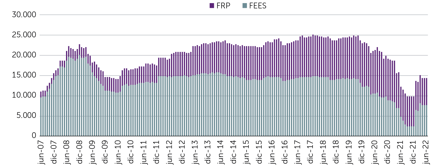 El FEES, cuyo valor de mercado al cierre de julio de 2022 fue de US$ 7.745 millones (Gráfico II.7), es una fuente adicional de financiamiento para el Gobierno Central que permite financiar déficits fiscales, realizar el aporte anual al FRP y realizar amortizaciones de la deuda pública. A julio de 2022 y desde su inicio, se han efectuado retiros desde el FEES por US$ 24.245 millones y aportes por US$ 27.763 millones (Cuadro II.1). Los últimos aportes se realizaron en enero y marzo de 2022, por un total de US$5.998 millones. Estos aportes permitieron que el fondo recuperara en parte su tamaño después de alcanzar su valor mínimo, desde su inicio, en enero de este año por US$ 2.414 millones. Cabe señalar que, aunque Chile cuenta con amplio acceso a financiamiento en los mercados internacionales en términos competitivos, el uso del FEES tiene la ventaja de permitir financiar las necesidades fiscales disminuyendo la necesidad de recurrir a la deuda pública.