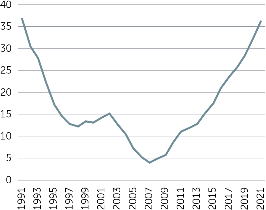 A fines de 2021, el stock de deuda bruta chilena era equivalente al 36,3% del PIB, ocho puntos porcentuales mayor al nivel de 2019, principalmente explicado por las mayores presiones de gasto derivadas de la pandemia de Covid-19 y su necesidad de financiación. En este contexto, la participación de deuda denominada en moneda extranjera rondó el 35% al cierre de 2021, en comparación al 20% histórico, incrementándose también la participación de instrumentos de corto plazo. Debido a ello, y enmarcado en un plan de consolidación fiscal, el plan de financiamiento para los próximos años se centrará en anclar el stock de deuda bajo el 45%, en el mediano plazo, buscando además la emisión en plazos más largos y reduciendo la participación denominada en monedas extranjeras.
