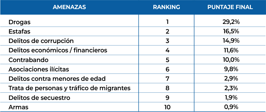 - Consulta a sujetos obligados sobre el nivel de relevancia de las amenazas de LA identificadas: Se aplicó un cuestionario a las entidades reportantes de los sectores público y privado, solicitando jerarquizar las principales amenazas de LA establecidas, en función de su actividad desarrollada.