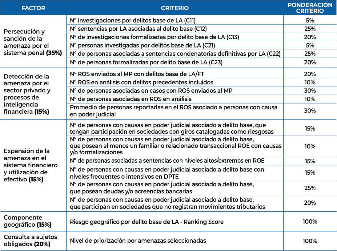 - Detección de la amenaza por el sector privado y procesos de inteligencia financiera: Incluye criterios asociados a la detección de la amenaza por el sector privado y a los procesos de inteligencia financiera realizados por la UAF.