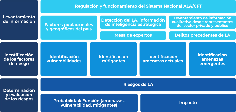Así, la ENR-LA fue elaborada con una metodología mixta que incorpora información cuantitativa y cualitativa, así como características particulares del país, lo que permite identificar, medir y evaluar los riesgos nacionales de LA, y revisar cada uno de los componentes institucionales, normativos y operativos asociados con el fenómeno del LA.