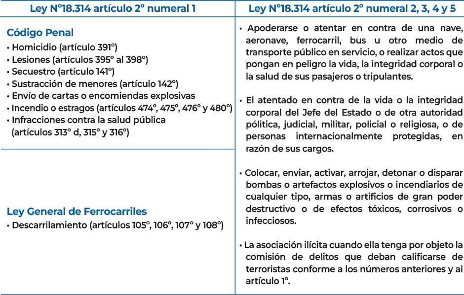 Según el artículo 1° de la Ley N°18.314 son delitos terroristas aquellos que tienen como finalidad “producir en la población o en una parte de ella el temor justificado de ser víctima de delitos de la misma especie, sea por la naturaleza y efectos de los medios empleados, sea por la evidencia de que obedece a un plan premeditado de atentar contra una categoría o grupo determinado de personas, sea porque se cometa para arrancar o inhibir resoluciones de la autoridad o imponerle exigencias”.