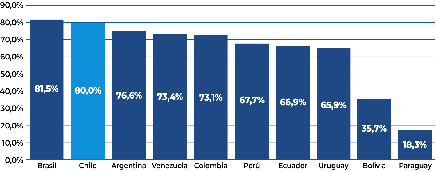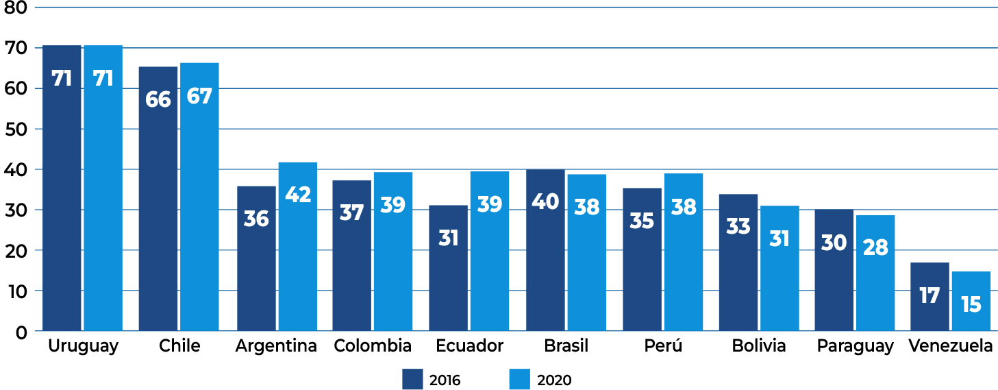 El informe 2020 de Transparencia Internacional que mide la percepción de corrupción)⁹, sitúa a Chile en el puesto 25 de un total de 180 países considerados en la medición (con puntaje 67, donde el óptimo es 100). Con esto, iguala en puntaje y puesto a Estados Unidos, y se posiciona como el segundo país de mejor desempeño en América Latina y El Caribe, detrás de Uruguay, ubicado en el puesto número 21, con puntaje de 71/100 (Transparency International, 2020, pág. 2). Este escenario a nivel sudamericano (y latinoamericano) se ha mantenido relativamente constante durante el último quinquenio (2016-2020).