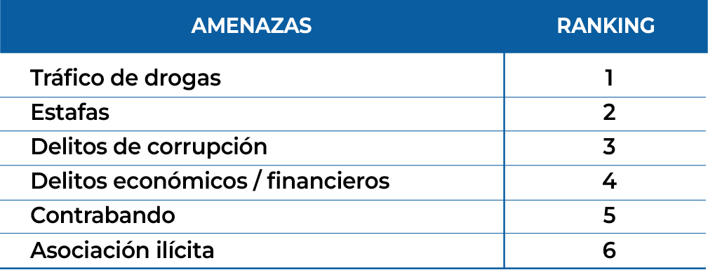 En el siguiente capítulo se identifican las amenazas actuales del país relacionadas con el LA, que corresponden a la ponderación de cinco factores, en los cuales se agrupan, en conjunto,