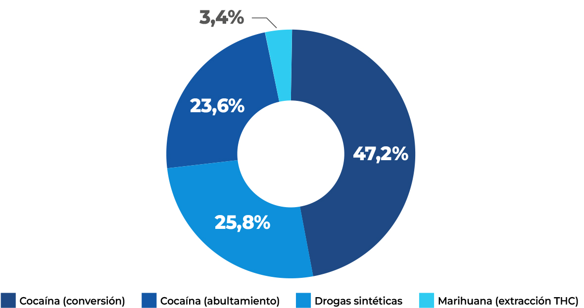 El Informe 2021 del Observatorio del Narcotráfico agrega, que era usual encontrar laboratorios de abultamiento de cocaína (los cuales se siguen manteniendo), pero que en el transcurso de los últimos años han aparecido laboratorios de conversión de cocaína, laboratorios para generar drogas sintéticas, y laboratorios de extracción del principio activo de las matas de marihuana (Fiscalía Nacional, 2021, pág. 35).