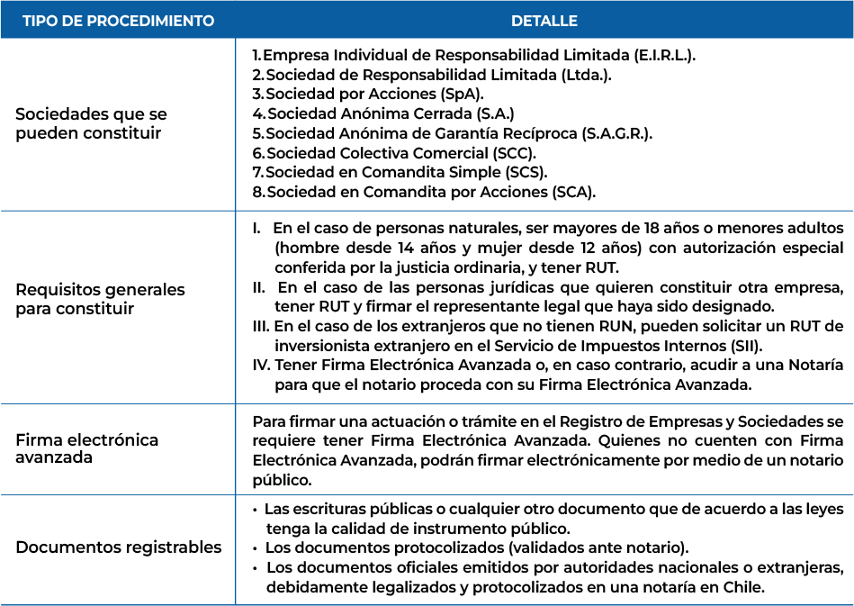 Respecto de la creación de sociedades comerciales en Chile, estas se pueden constituir a través de dos regímenes: Primero, denominado régimen general con base en las leyes particulares que regulan a cada tipo de persona jurídica; y segundo, régimen simplificado bajo la Ley N°20.659 que, desde mayo del año 2013, ha implementado de forma gradual la constitución de sociedades a través de un sitio en línea. A continuación, se expone la constitución de personas jurídicas según el tipo de régimen: