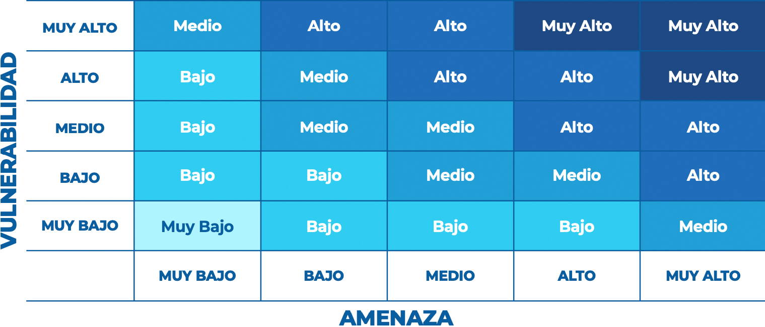 Una vez concluido lo anterior, se realizó una matriz de cruce que relacionó ambas dimensiones (amenazas y vulnerabilidades), se determinaron los riesgos y se asignó una escala de valoración asociada a la probabilidad estimada de ocurrencia de cada uno.