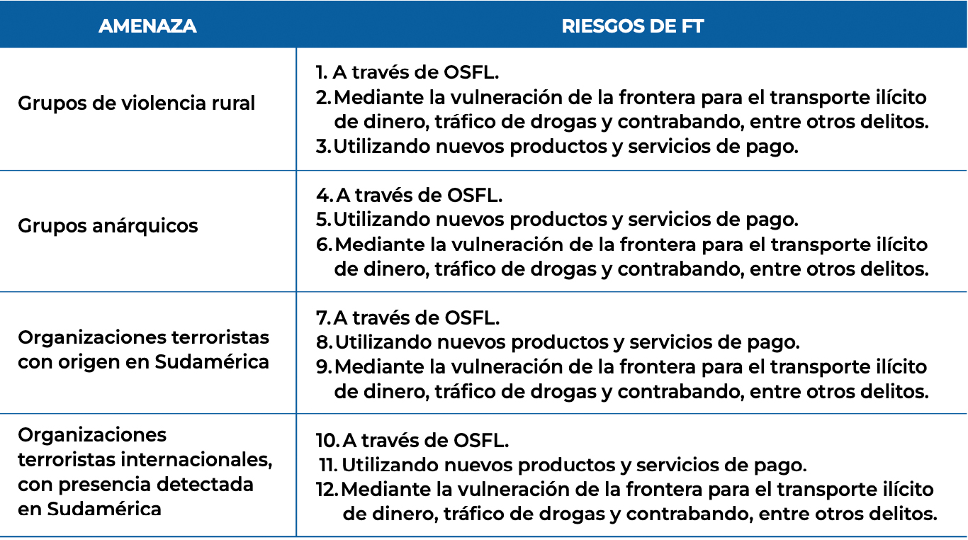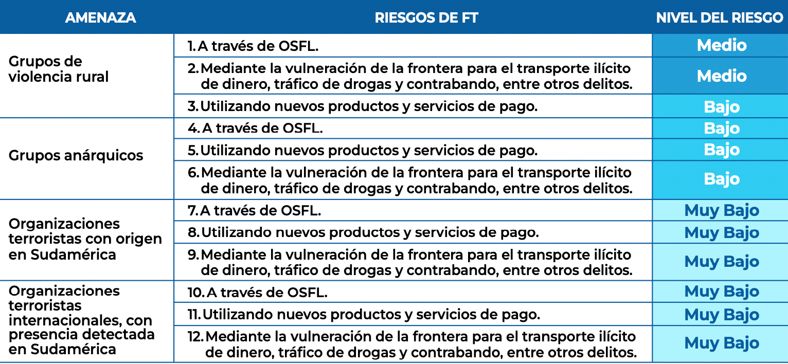 En el marco de la determinación del riesgo, es necesario precisar que las vulnerabilidades asociadas con (i) la comprensión del riesgo de FT y (ii) marco legal del FT se consideraron vulnerabilidades de carácter transversal, por lo que las amenazas podrían sacar provecho de estas situaciones independiente de sus características. Dado lo anterior, no fueron consideradas a nivel específico en este apartado.