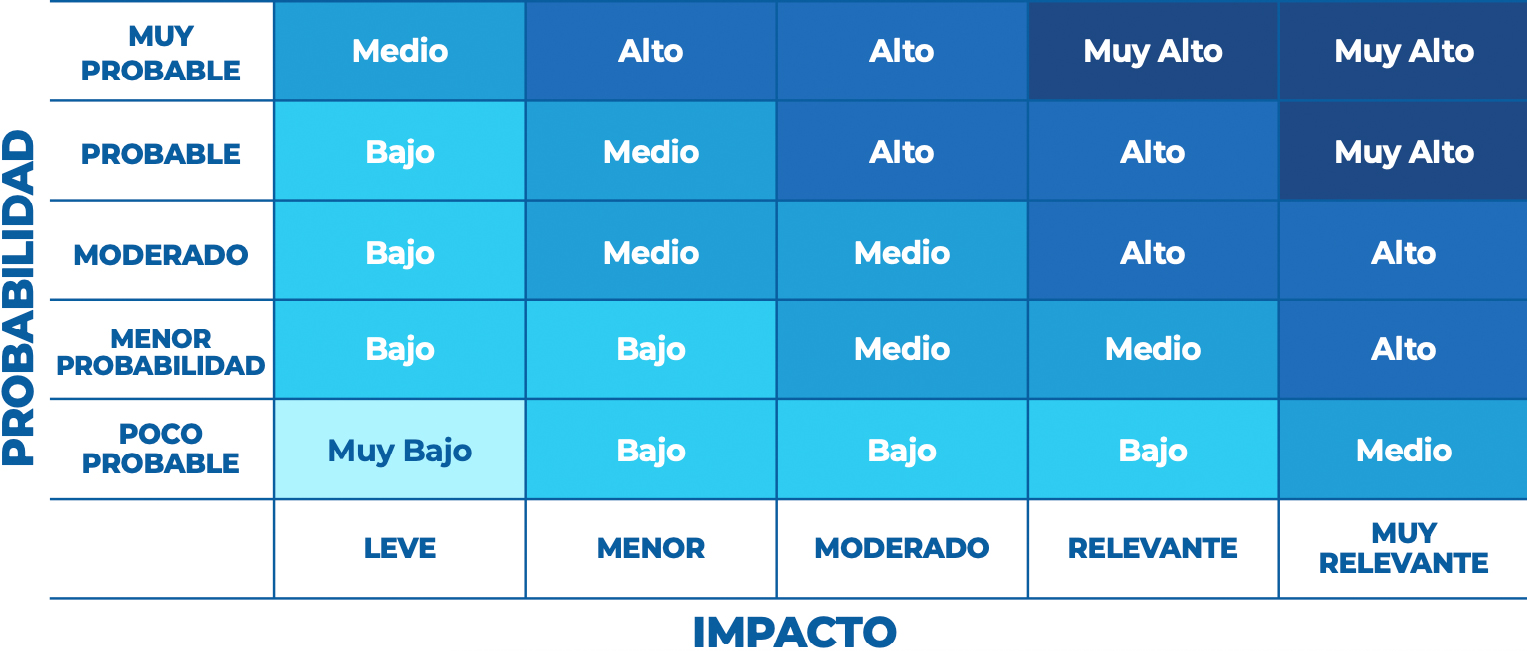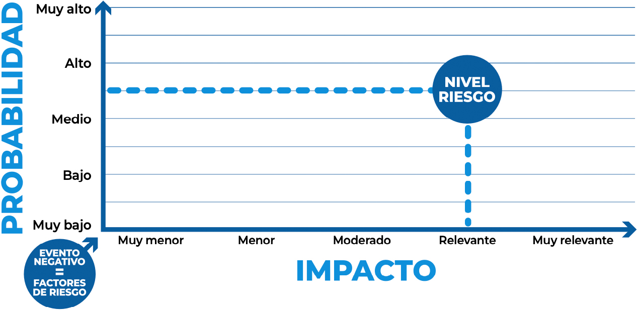 El grado de certeza o la probabilidad de ocurrencia de estos eventos negativos, y su impacto, representan el nivel o escala de riesgo, métrica que permite diferenciar eventos considerados más probables que otros menos frecuentes. En esta evaluación, la métrica utilizada para el nivel o escala de riesgo considera variables de carácter cualitativo.