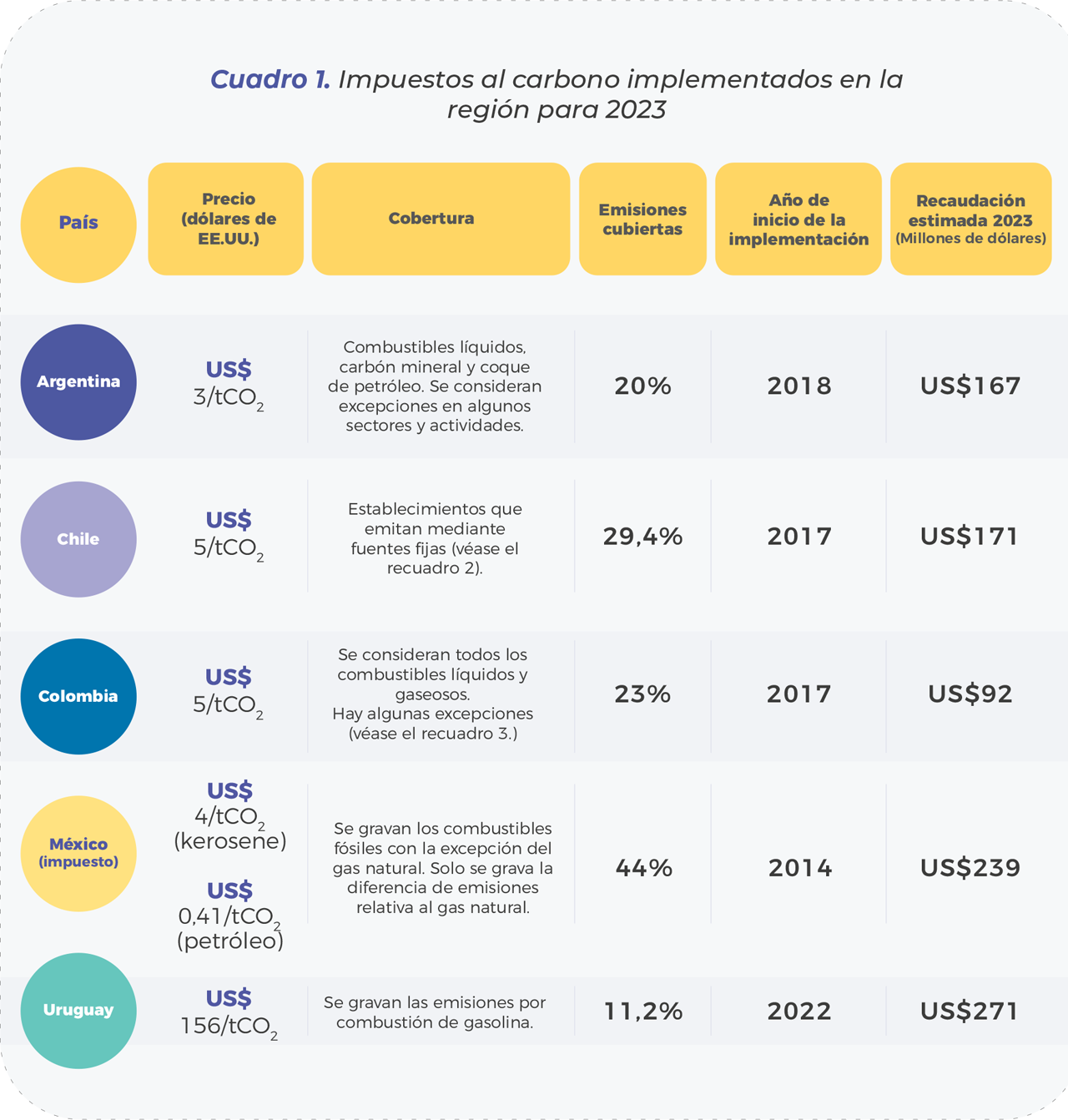 Desde su implementación bajo el Protocolo de Kioto, los precios al carbono han ganado cierta popularidad como un instrumento ambiental, y son promovidos por múltiples países y organismos internacionales. A la fecha, existen 73 iniciativas de precios al carbono implementadas a nivel global; estas cubren aproximadamente 12 gigatoneladas de CO2 equivalente, las que representan un 23% de las emisiones globales de GEI (Banco Mundial, 2023b). En América Latina y el Caribe, hay cinco países que ya implementaron precios al carbono –Argentina, Chile, Colombia, México y Uruguay–, con lo cual han cubierto un 17% de las emisiones regionales (véase el cuadro 1). Los cinco países consideran impuestos al carbono y, además, Chile, Colombia y México incluyen sistemas de compensación vía mercados de crédito de carbono. El impuesto al carbono de Uruguay no fue diseñado para ser compensado con créditos de carbono. A su vez, México se encuentra actualmente implementando un programa piloto de sistema de comercio de emisiones transables (Banco Mundial, 2023b).