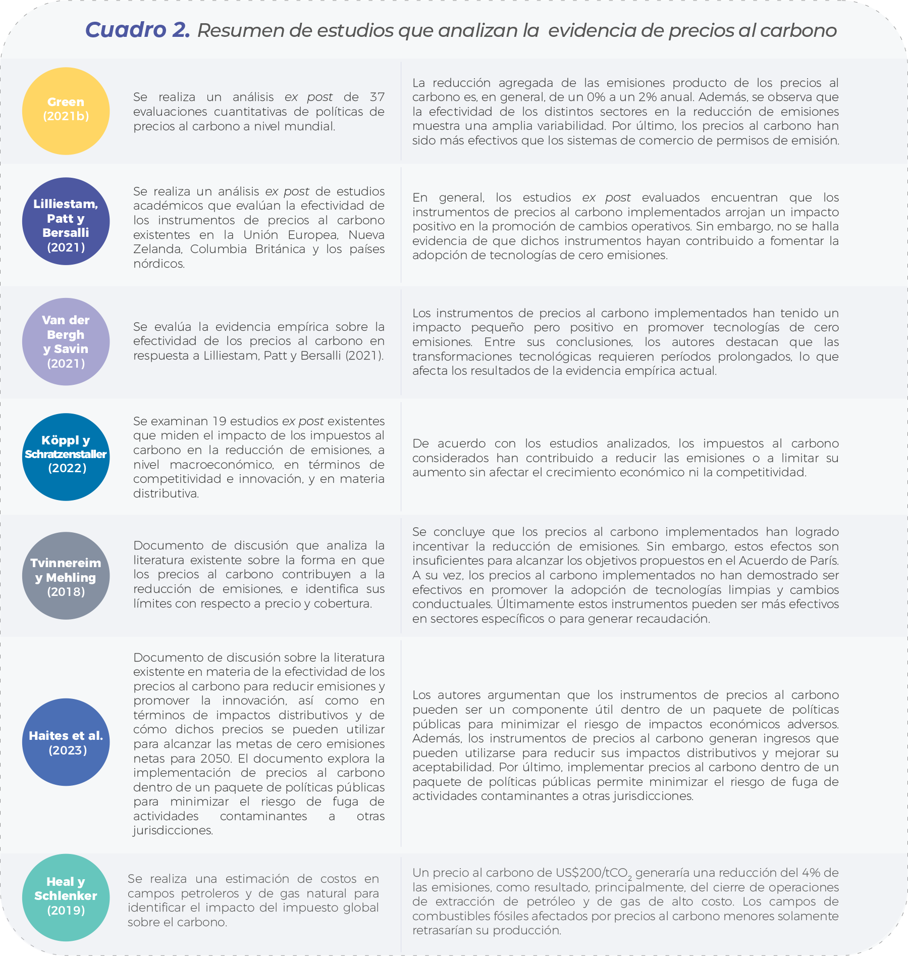 En general, los ministerios entrevistados se refieren a los precios del carbono como un instrumento que desean llevar a la práctica; sin embargo, reconocen que, en función de las condiciones de implementación, su efectividad para cumplir su objetivo principal (impulsar un cambio en los patrones de conducta e inversiones) será limitada. Por lo mismo, las expectativas de dichas entidades son moderadas. A continuación, se contrastan estas expectativas con la literatura existente. Para ello, se revisan trabajos que analizan la evidencia diversa de la efectividad de los precios al carbono (cuadro 2). También se examinan estudios de casos particulares, trabajos que se centran en las barreras para implementar precios al carbono efectivos y otros que se enfocan en los obstáculos que impiden en la economía las transformaciones necesarias congruentes con la neutralidad de emisiones.