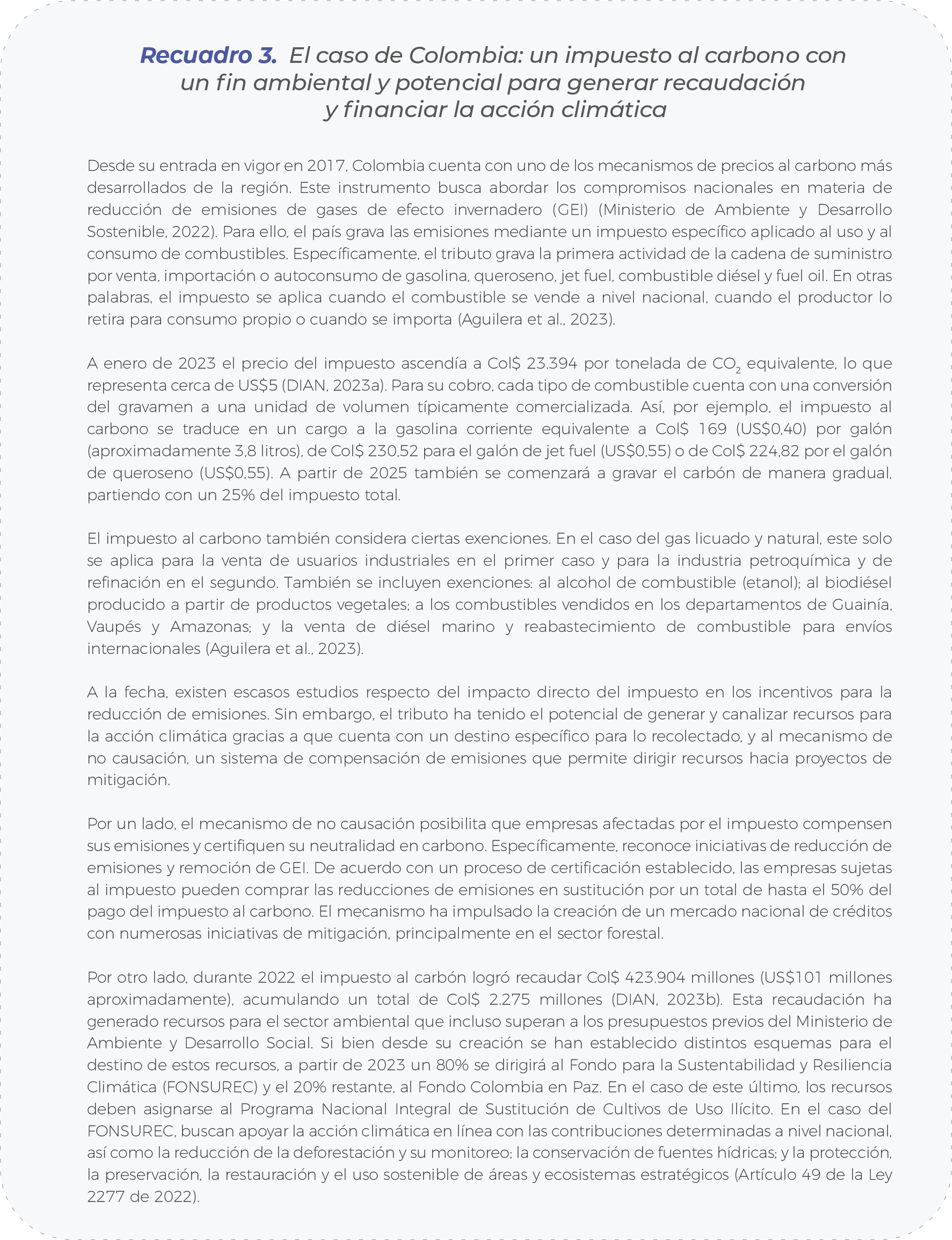 En América Latina y el Caribe se destaca el impuesto al carbono de Colombia. Originalmente diseñado con el objetivo de generar incentivos para la transición, el gravamen ha logrado aplicarse también para financiar la acción climática. Con un total aplicado a los combustibles fósiles de cerca de US$5/tCO2, el gravamen ha generado importantes recaudaciones para el país, superando los US$100 millones en 2022. Esta recaudación representa cerca de un 0,1% del presupuesto del gobierno de ese año, pero supera el presupuesto del Ministerio de Ambiente y Desarrollo Sostenible de algunos años previos. Además, el recaudo tiene un destino específico: el 80% de los recursos se dirigen al Fondo para la Sustentabilidad y Resiliencia Climática y el 20% restante, al Fondo Colombia en Paz. El recuadro 3 presenta un análisis detallado.