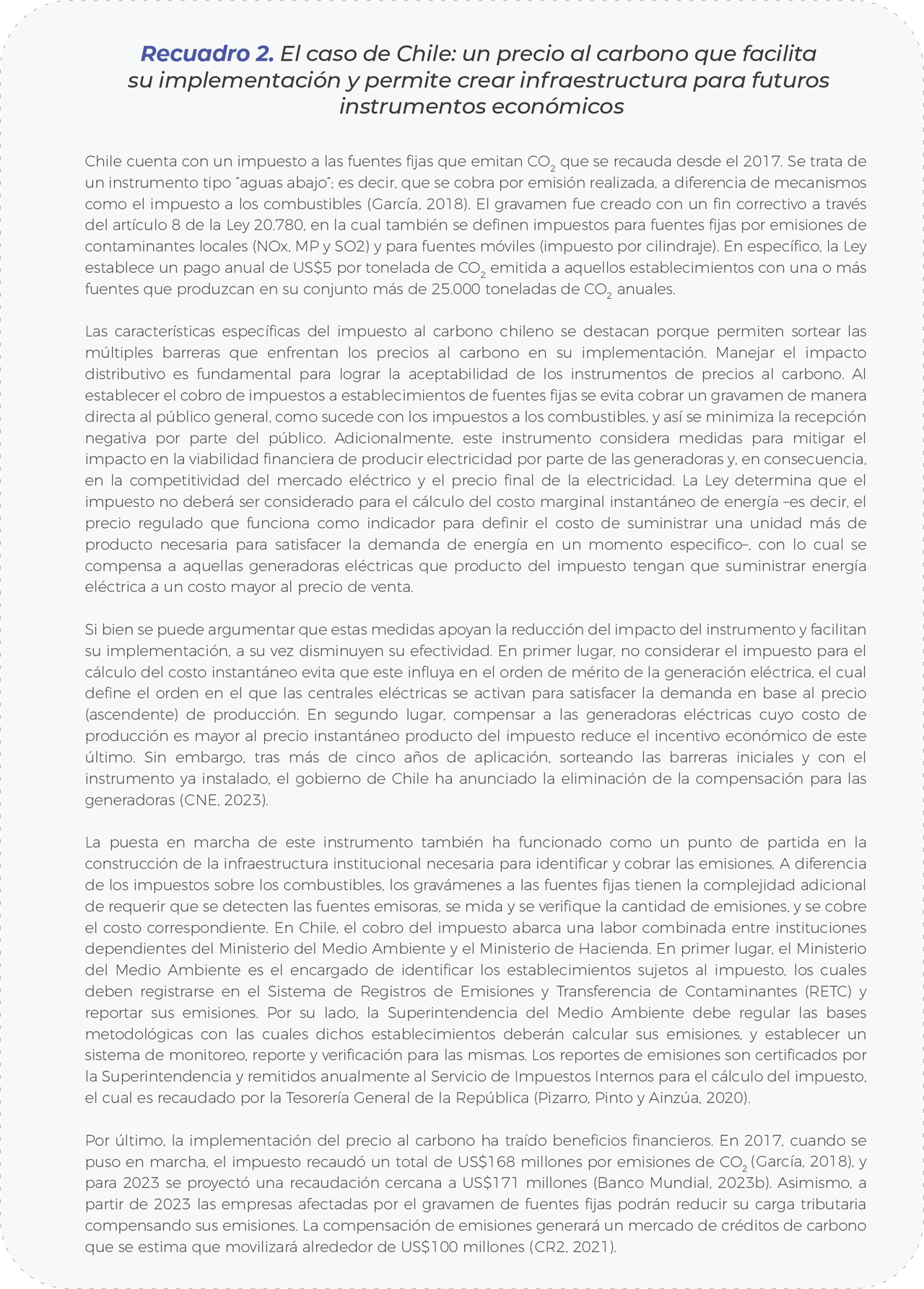 Una alternativa para reducir los impactos distributivos y en consecuencia promover una transición justa es usar parte de los ingresos del impuesto para compensar el alza en costos de los precios con acciones como transferencias monetarias, programas de beneficios o reducción de impuestos y tarifas. El gravamen al carbono de Chile mitiga los efectos del impacto distributivo. Por un lado, se cobra a establecimientos emisores en vez de cobrarse directamente a los consumidores como es el caso de los impuestos a los combustibles. Adicionalmente, el impacto del precio al carbono en el costo de la energía se mitiga al no considerarlo en el cálculo del costo instantáneo de la energía; es decir, al precio regulado que funciona como indicador para definir el costo de suministrar energía desde las generadoras eléctricas hasta los consumidores finales. El recuadro 2 presenta un análisis detallado del caso del impuesto al carbono de Chile.