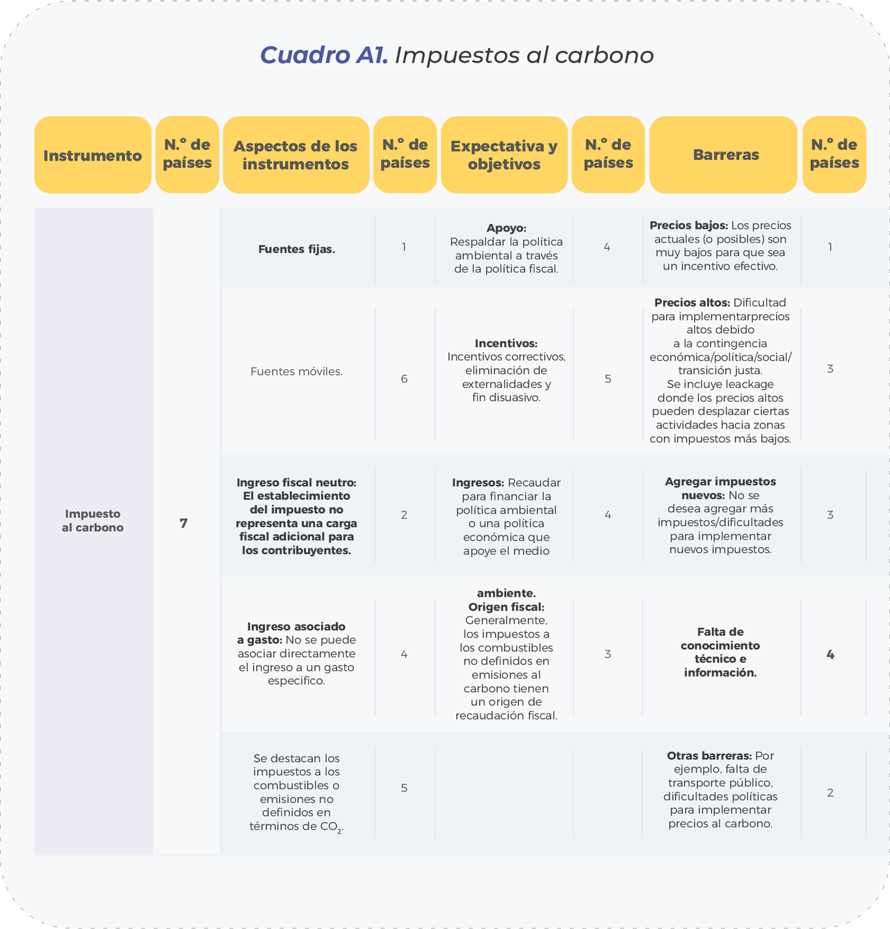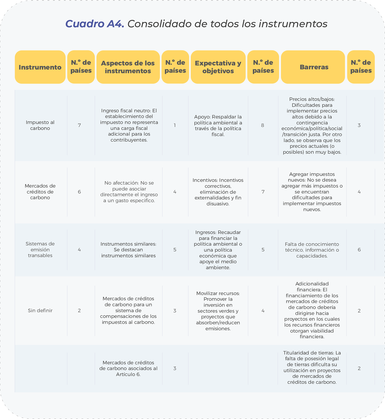 Nota: Las columnas “N.°” indican la cantidad de países asociados a los conceptos explicitados en la columna inmediatamente a la izquierda. Los países pueden aparecer en más de una respuesta, por lo que las columnas no suman el total de países. La columna “Aspecto de los instrumentos” contiene los países que ya cuentan con un mecanismo de precios al carbono o que están interesados en implementar uno.