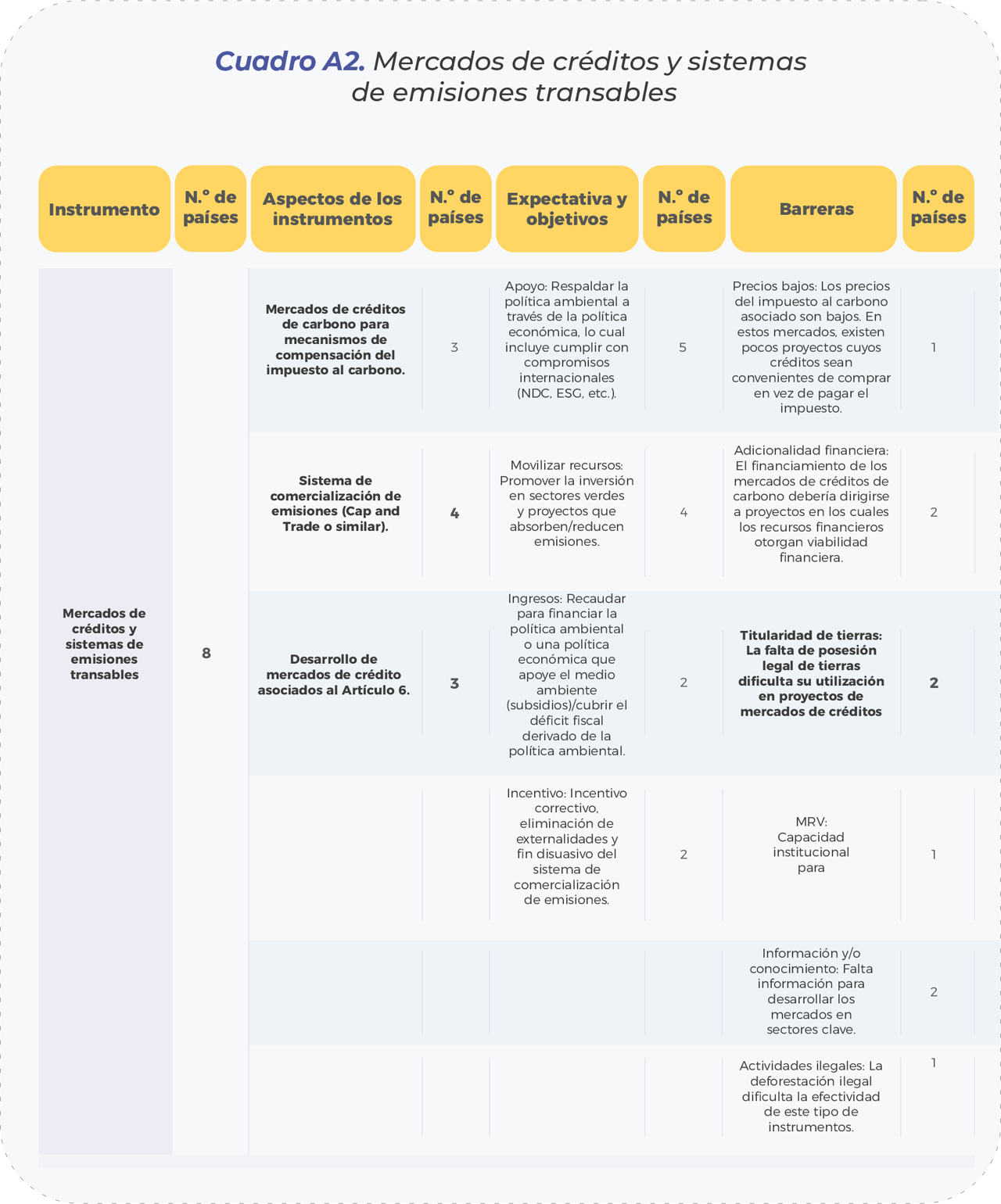 Nota: Las columnas “N.°” indican la cantidad de países asociados a los conceptos explicitados en la columna inmediatamente a la izquierda. Los países pueden aparecer en más de una respuesta, por lo que las columnas no suman el total de países. La columna “Aspectos de los instrumentos” contiene los países que ya cuentan con un mecanismo de mercado de crédito de carbono o un sistema de comercio de emisiones, o que están interesados en implementar uno.