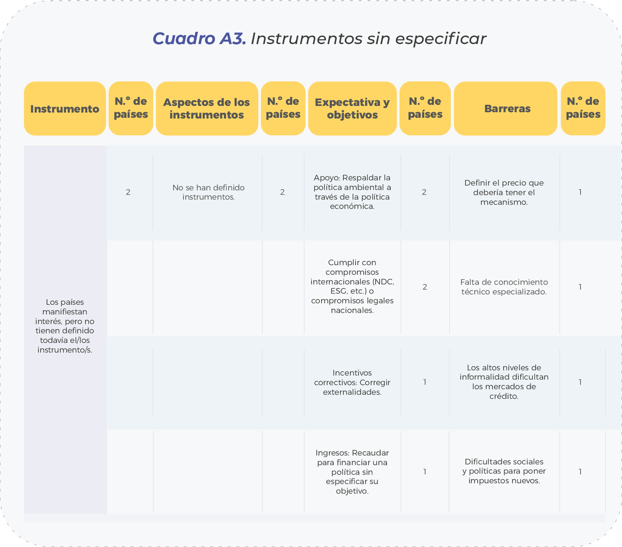 Nota: Las columnas “N.o” indican la cantidad de países asociados a los conceptos explicitados en la columna inmediatamente a la izquierda. Los países pueden aparecer en más de una respuesta, por lo que las columnas no suman el total de países. La columna “Aspectos de los instrumentos” contiene los países que ya cuentan con un mecanismo de precios al carbono o que están interesados en implementar uno.