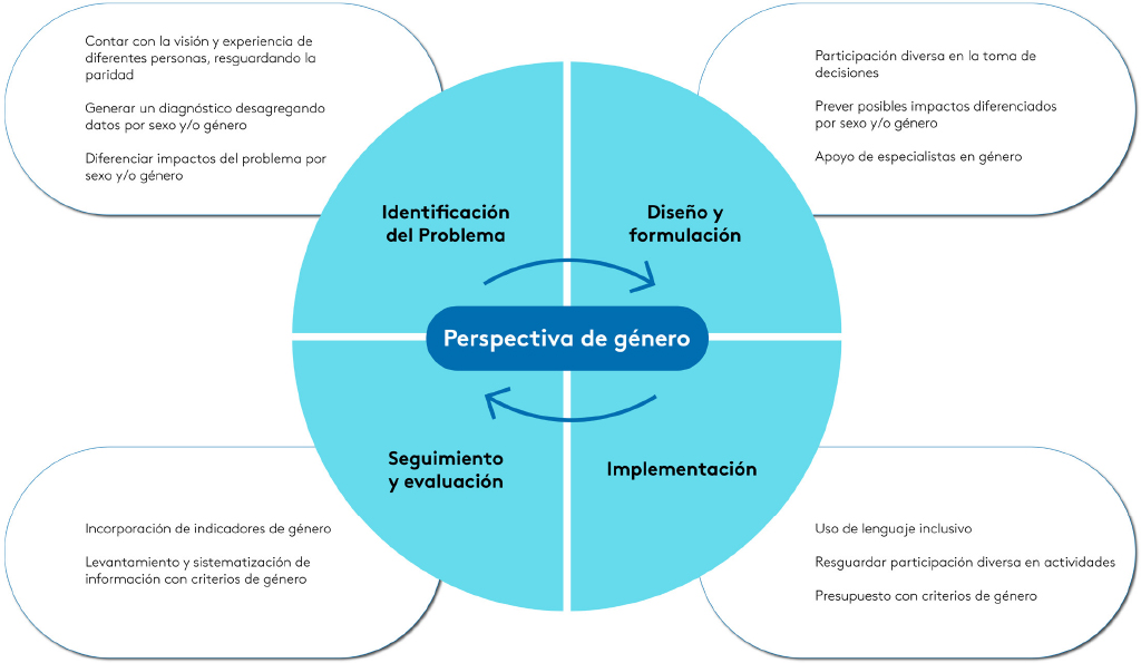 En ese sentido, la perspectiva de género es entendida como la forma de ver, analizar e interpretar el impacto que tiene el género en las relaciones sociales, permitiendo observar cómo influye en la distribución del poder, en el desigual acceso a oportunidades y en la diferenciación de roles e interacciones entre personas (IIDH, 2008; ONU Mujeres, s. f.-b). A partir de esto, la incorporación de la perspectiva de género es un aspecto clave en todo el ciclo del proyecto y, por tanto, debe ser abordada de manera transversal para evitar la reproducción de desigualdades.