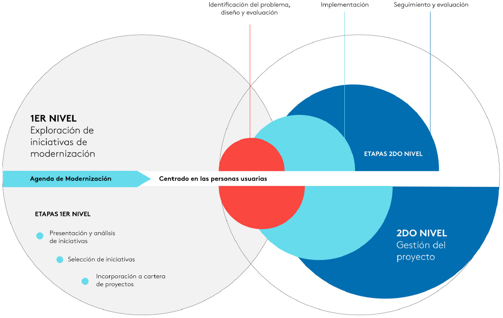 De acuerdo a lo anterior, y dado que cada iniciativa abordada posee matices en cuanto al nivel de acompañamiento, se plantea la metodología de un proyecto de modernización en base a dos niveles: a) uno más amplio que involucra el proceso de exploración de las iniciativas, y b) otro más detallado que se enfoca en la gestión del proyecto en sí mismo. Esta estructura integrada permite que las iniciativas se alineen con los objetivos de modernización más amplios y que la Secretaría pueda coordinar, acompañar y hacer seguimiento efectivo de los proyectos, garantizando así una mejor gestión del cofinanciamiento y el logro de los objetivos estratégicos.