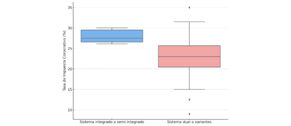 El boxplot que se muestra en el gráfico 3 muestra la distribución del impuesto corporativo para los países de la OCDE, distinguiendo entre aquellos que utilizan un sistema integrado o semi integrado y aquellos con un sistema dual o variantes. Se desprende que el promedio de la tasa de impuesto corporativo para los países con sistema integrados o semi integrado es de aproximadamente 27,92%, mientras que, para los países con sistema dual o variantes, la tasa promedio es menor, alrededor del 23%. Además, la distribución muestra que los países con sistema de imputación presentan menor variabilidad en sus tasas, mientras que en los países con sistemas duales se observa una mayor dispersión.