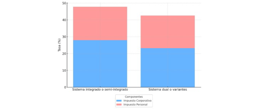 En resumen, los países con sistemas de imputación aplican tasas de impuesto corporativo más altas para, presumiblemente, compensar la pérdida de ingresos fiscales generada por la devolución de créditos fiscales a los accionistas. Por otro lado, los países con sistemas duales evitan esta complejidad al gravar separadamente las rentas del capital y los ingresos personales, lo que les permite mantener tasas corporativas más bajas.