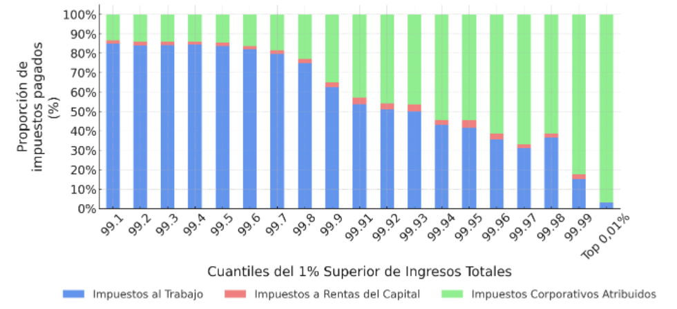 Descomposición de impuestos totales pagados para cuantiles de la distribución de contribuyentes pertenecientes al 1% de mayores ingresos.