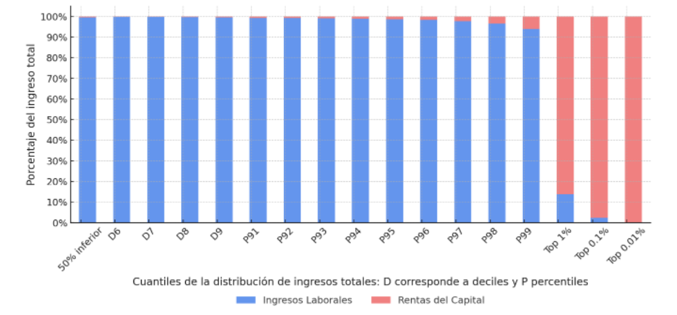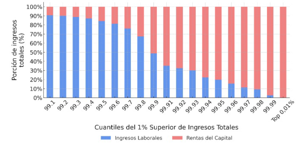 Composición de los ingresos totales para cuantiles del 1% de contribuyentes de más altos ingresos