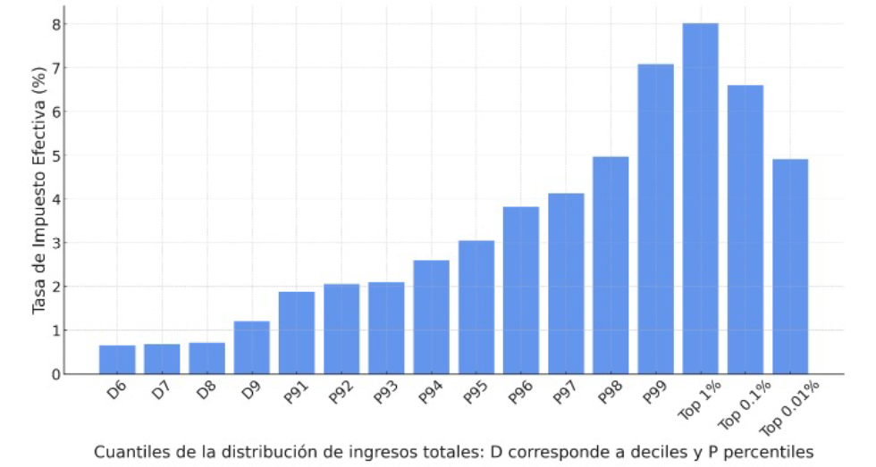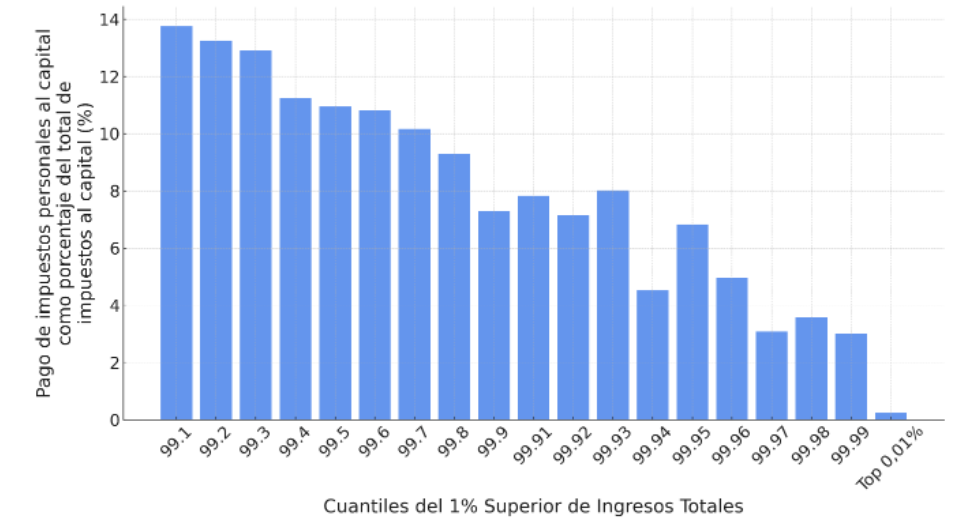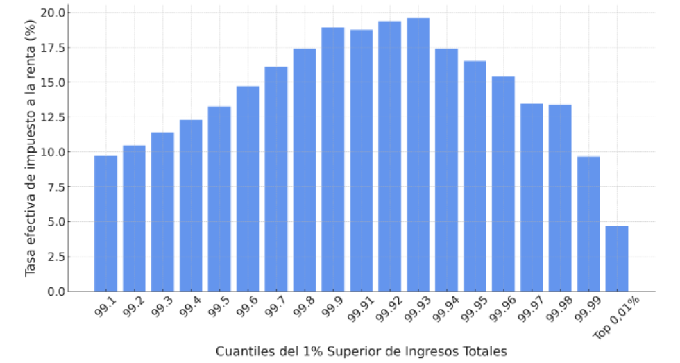 Considerando al subconjunto de contribuyentes que pertenecen al 1% de más altos ingresos, se observa que la tasa efectiva de impuesto a la renta exhibe un comportamiento progresivo hasta el cuantil número 99,93 (es decir, para el tercer decil de contribuyentes que pertenecen al 0,1% de más altos ingresos), a mayor ingreso, mayor tasa efectiva de impuesto a la renta. Para dicho cuantil la tasa efectiva de impuesto a la renta es cerca de 20%. Este patrón creciente se revierte a partir del cuantil número 99,94, disminuyendo hasta alcanzar un 5% de tasa de impuesto efectiva para el 0,01% de contribuyentes de más altos ingresos.