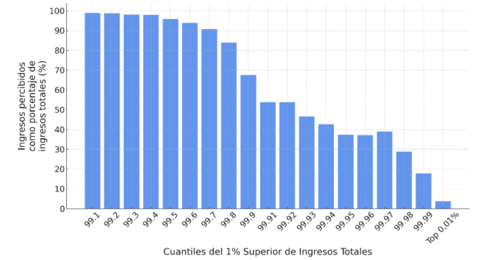 Ingresos percibidos como porcentaje de ingresos totales, para cuantiles de contribuyentes pertenecientes al 1% de más altos ingresos
