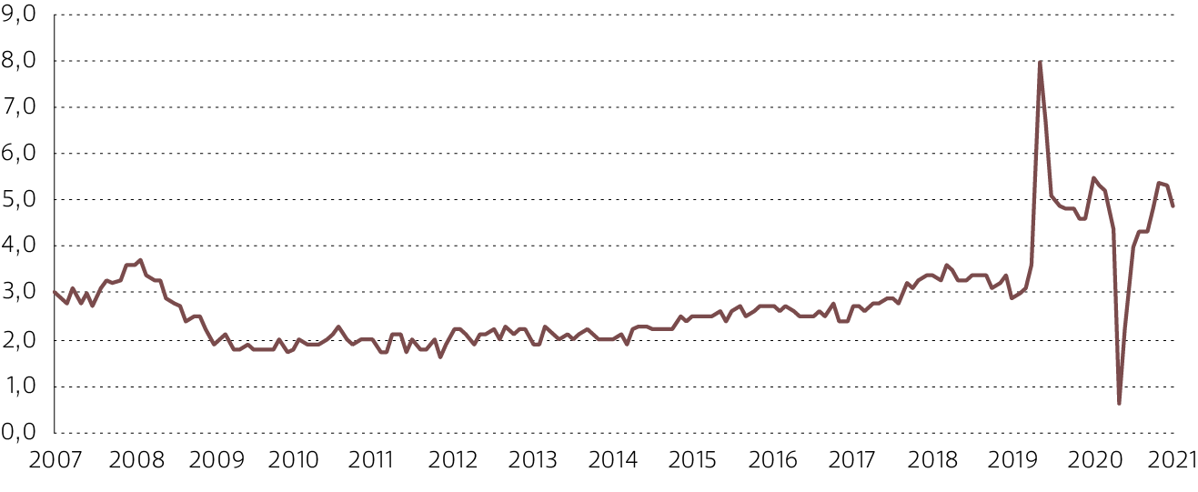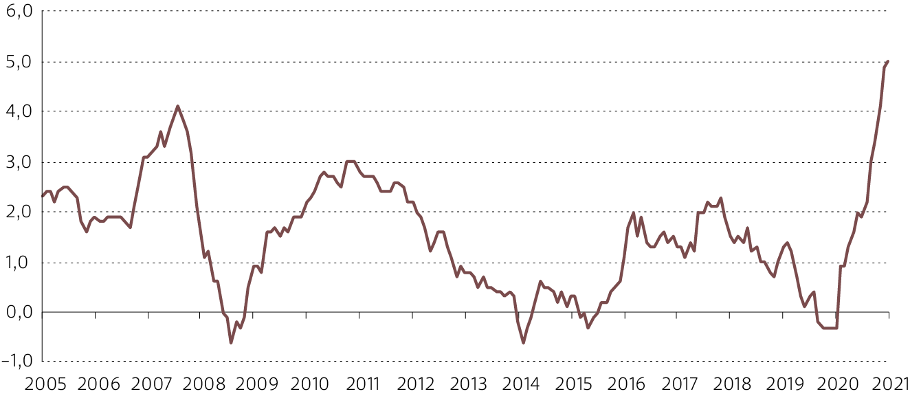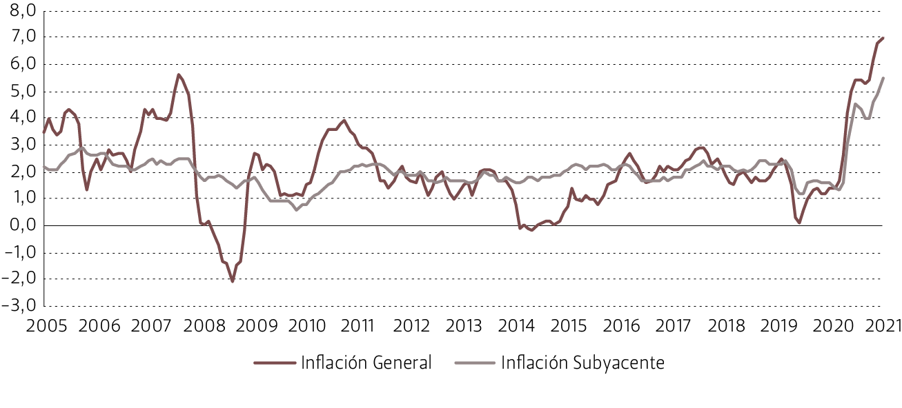 Evolución inflación anual de la Zona Euro, 2005 - 2021[27]