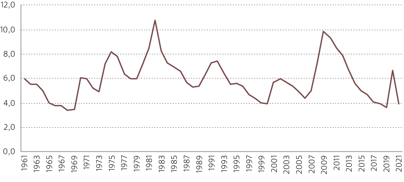 Evolución de la tasa de desempleo de EE.UU., 1961 - 2021
