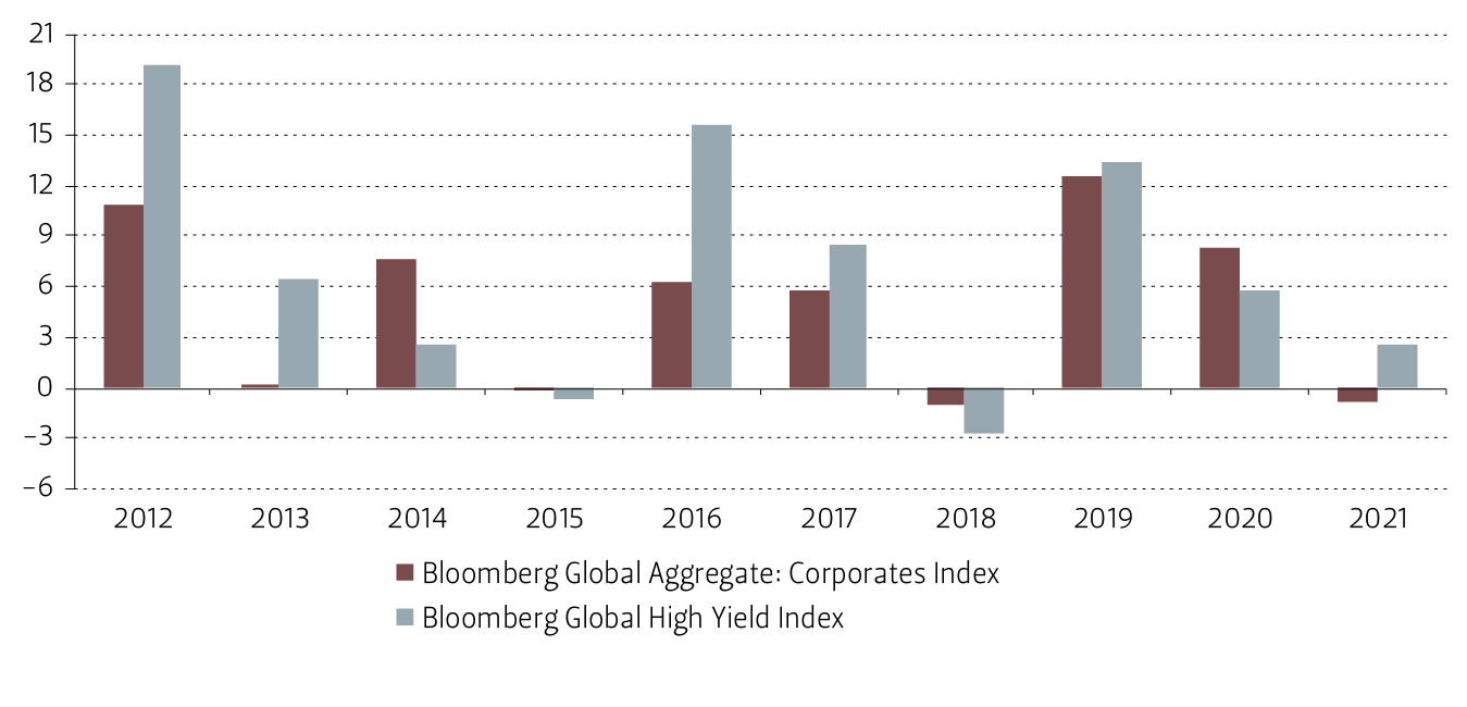 Retornos índices Bloomberg Global: Aggregate Corporates (hedged) y High Yield (hedged), 2012 – 2021