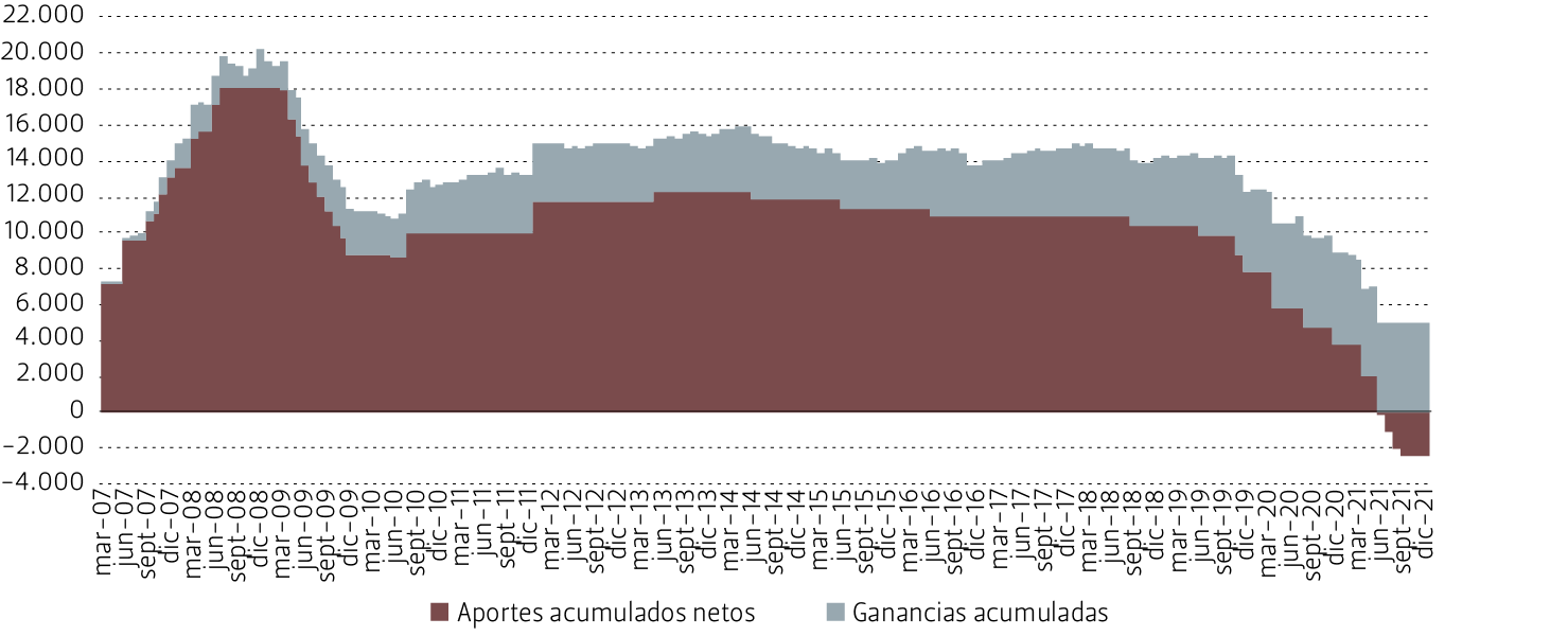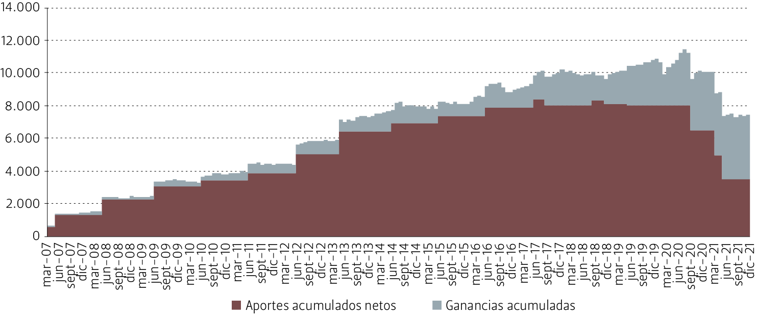 Evolución del valor de mercado del Fondo de Reserva de Pensiones, marzo 2007 - diciembre 2021