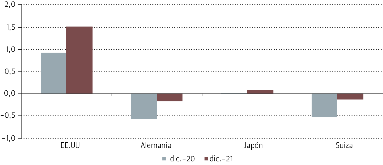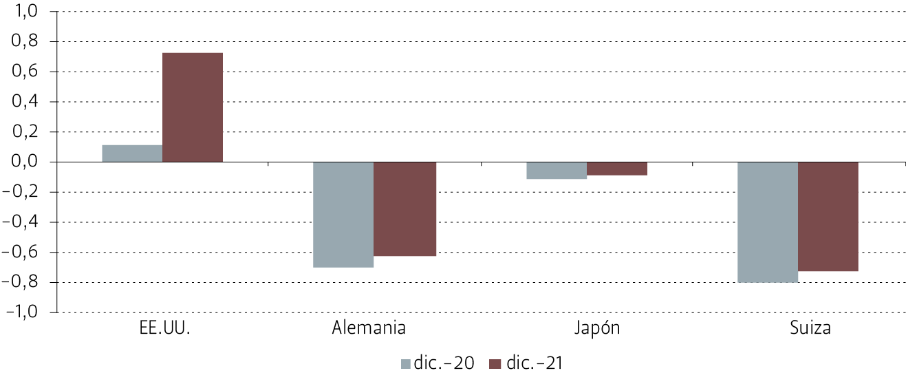 Al cierre de año, las tasas de interés soberanas nominales a 2 y a 10 años habían aumentado en relación con los niveles observados a finales del año anterior en EE.UU., Alemania, Suiza y Japón (véase Figura 15 y 16).