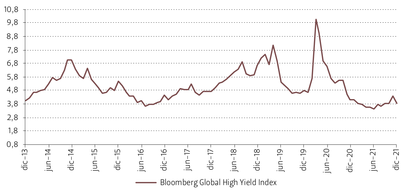 Con relación al mercado corporativo en 2021, los spreads de los sectores industrial, servicios públicos y financiero del índice “Bloomberg Global Aggregate Corporate” alcanzaron máximos anuales en noviembre de 1,0%, 1,1% y 1,0%, respectivamente, sin embargo, finalizaron el año en niveles similares a los del cierre del año anterior (véase Figura 17). Por su parte, los bonos de alto rendimiento experimentaron una leve disminución en sus spreads con respecto al año 2020. Esto se puede constatar al observar los spreads del índice “Bloomberg Global High Yield” que, a pesar de alcanzar un máximo de 4,4% en noviembre, finalizaron el año en 3,8%, menor al 4,1% del cierre de 2020 (véase Figura 18).