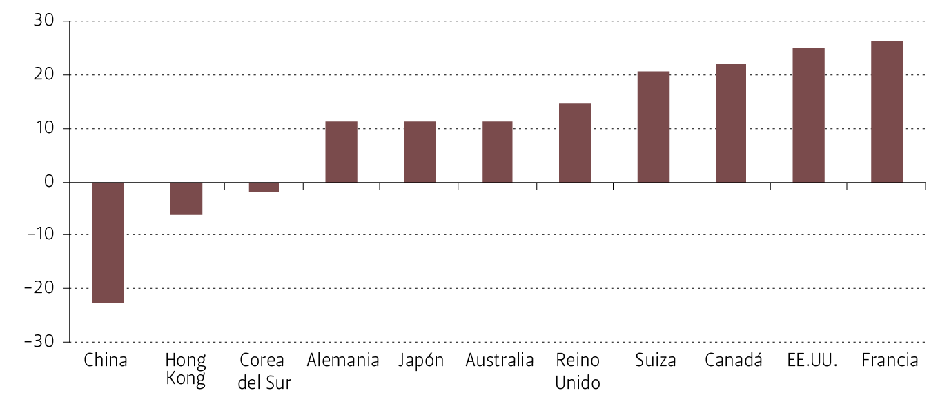 Durante 2021 se observaron importantes aumentos y caídas en los precios de las acciones. Para la muestra seleccionada (véase Figura 13), los mercados bursátiles tuvieron retornos mixtos. Así, las bolsas con mejor desempeño fueron las de Francia, EE.UU. y Canadá, cuyos retornos, medidos en moneda de origen, fueron de 26,7%, 25,2% y 22,3%, respectivamente. Los índices que tuvieron el peor rendimiento en términos relativos, en moneda de origen, fueron los de China, Hong Kong y Corea del Sur, los cuales fueron de -22,4%, -5,9% y -1,6%, respectivamente.