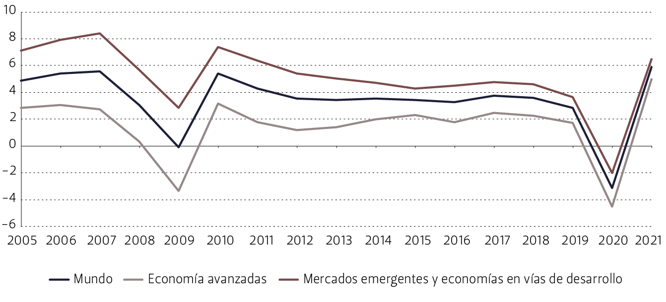 El transcurso del año estuvo marcado por la recuperación económica originada por la reapertura de las distintas economías en el mundo, junto con problemas logísticos en las cadenas de suministro, la crisis energética, la mayor inflación y la aparición de nuevas variantes del COVID-19 que han agregado incertidumbre a la recuperación. En este escenario, según las estimaciones del Fondo Monetario Internacional (FMI)[24], la economía mundial creció 5,9% durante el año 2021, frente a una contracción de 3,1% en 2020.