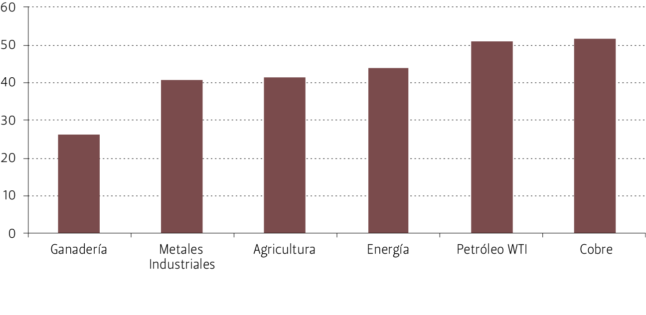 Al comparar los precios promedios de los commodities de 2021 versus los de 2020, se observan variaciones positivas en el sector de ganadería, metales industriales, agricultura y energía. También, destaca el aumento de 50,7% y 51,5% en los precios promedio del petróleo y cobre (véase Figura 21).