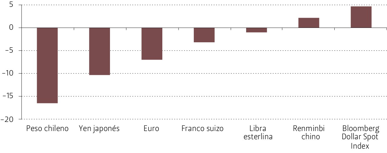 En este contexto global, el dólar de EE.UU. se fortaleció respecto de las principales monedas del mundo en 4,7% (véase Figura 12)[28]. Entre las principales divisas en que se invierten los fondos soberanos, el yen japonés y el euro fueron las monedas que más se depreciaron (10,3% y 6,9%, respectivamente). Cabe señalar que el peso chileno se depreció 16,5%.