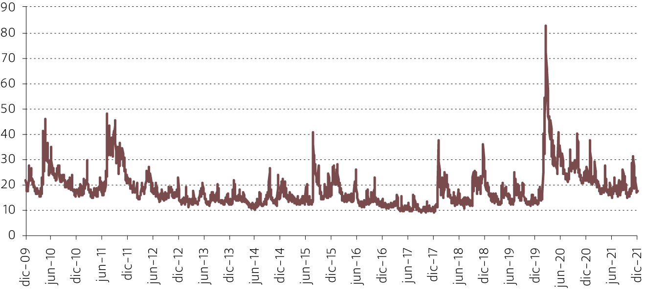 Evolución de la volatilidad (VIX) en el mercado accionario (S&P 500), 2009 - 2021