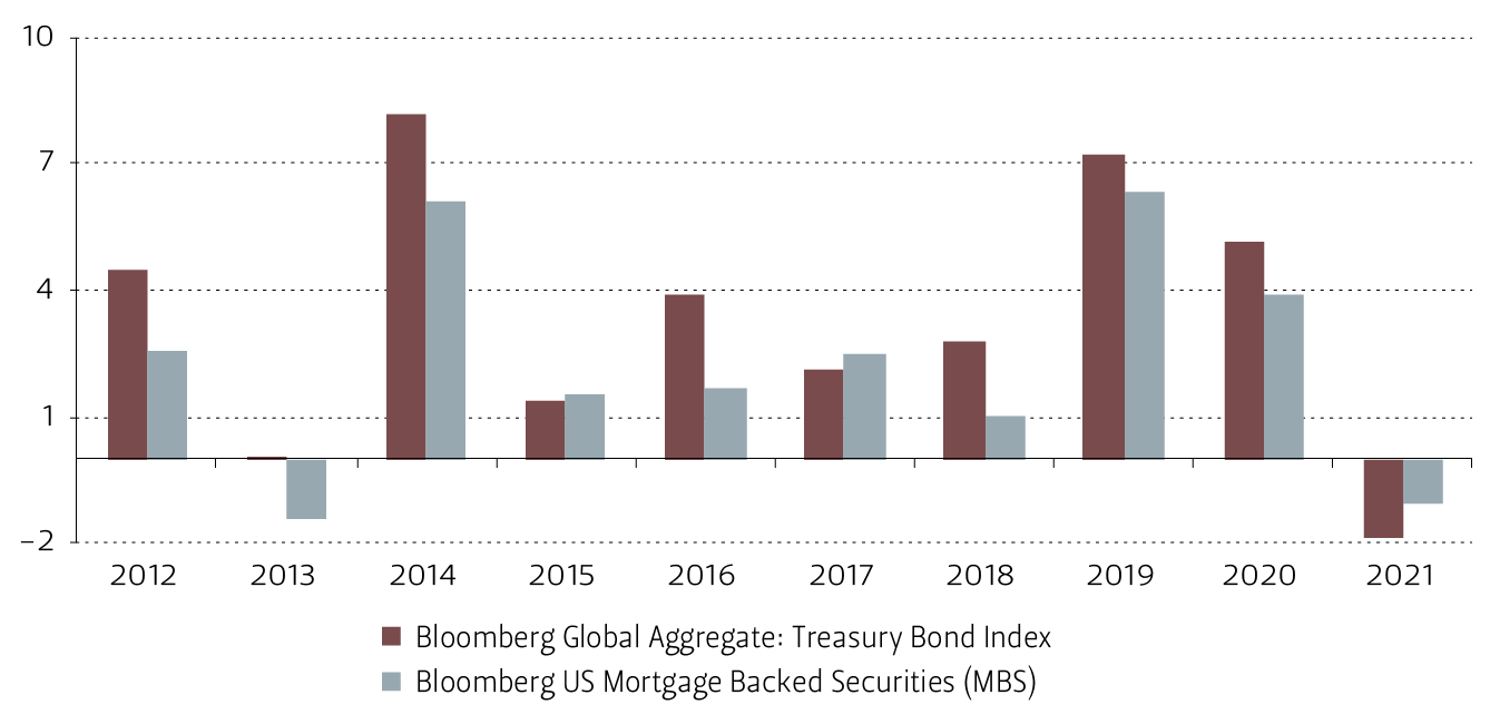 Retornos índices Bloomberg: Global Aggregate Treasury bonds (hedged) y US MBS (hedged), 2012 - 2021