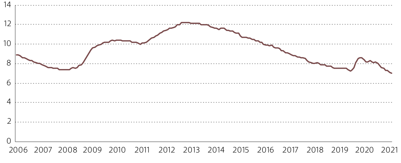 Evolución tasa de desempleo de la Zona Euro, 2005 - 2021