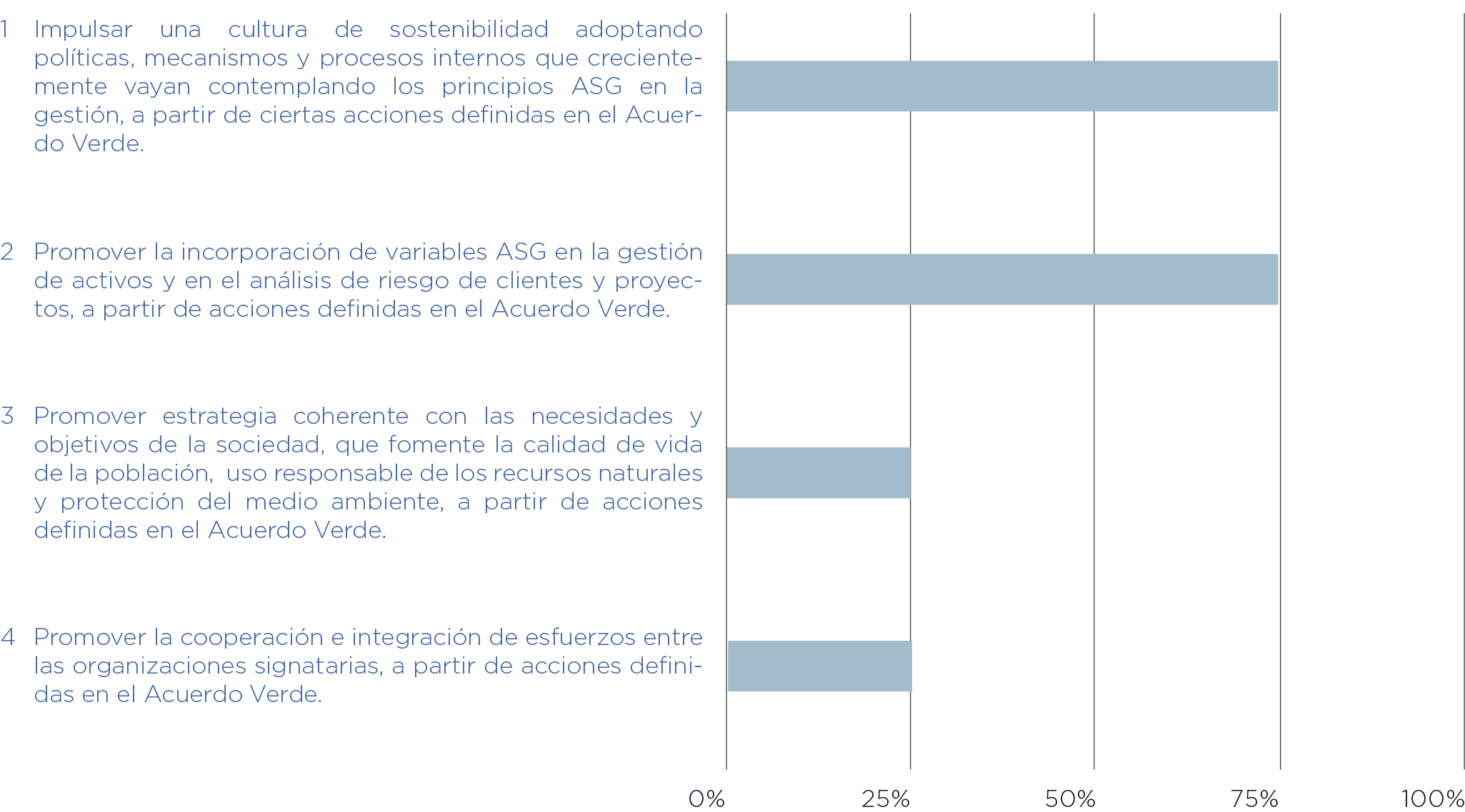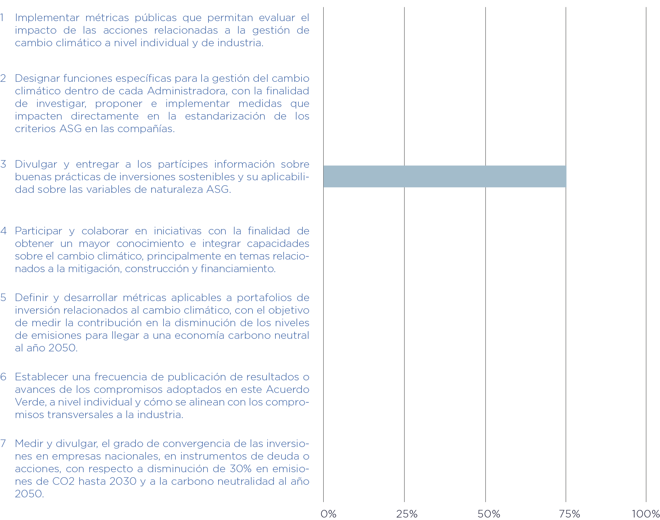 La Comisión para el Mercado Financiero adquirió 5 compromisos en el marco del Acuerdo Verde. El porcentaje de progreso total a la fecha corresponde a 75% y el avance en cada compromiso en particular se puede observar en el siguiente gráfico.