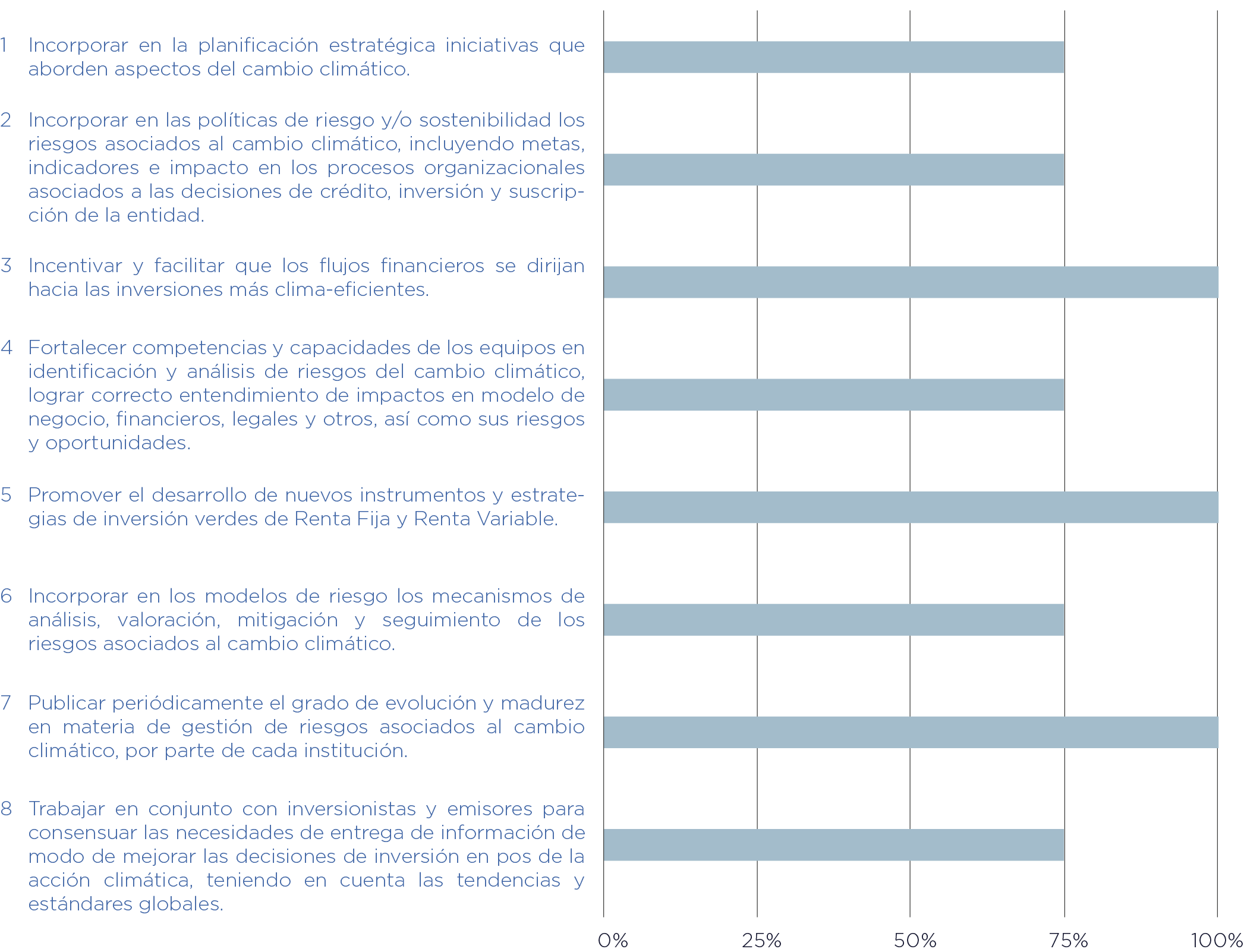 Por último, los Intermediaros de Valores se comprometieron a implementar 8 compromisos. El porcentaje de progreso total para esta industria corresponde a 84%. En el gráfico presentado a continuación se puede evaluar el avance a la fecha para cada uno de los compromisos.