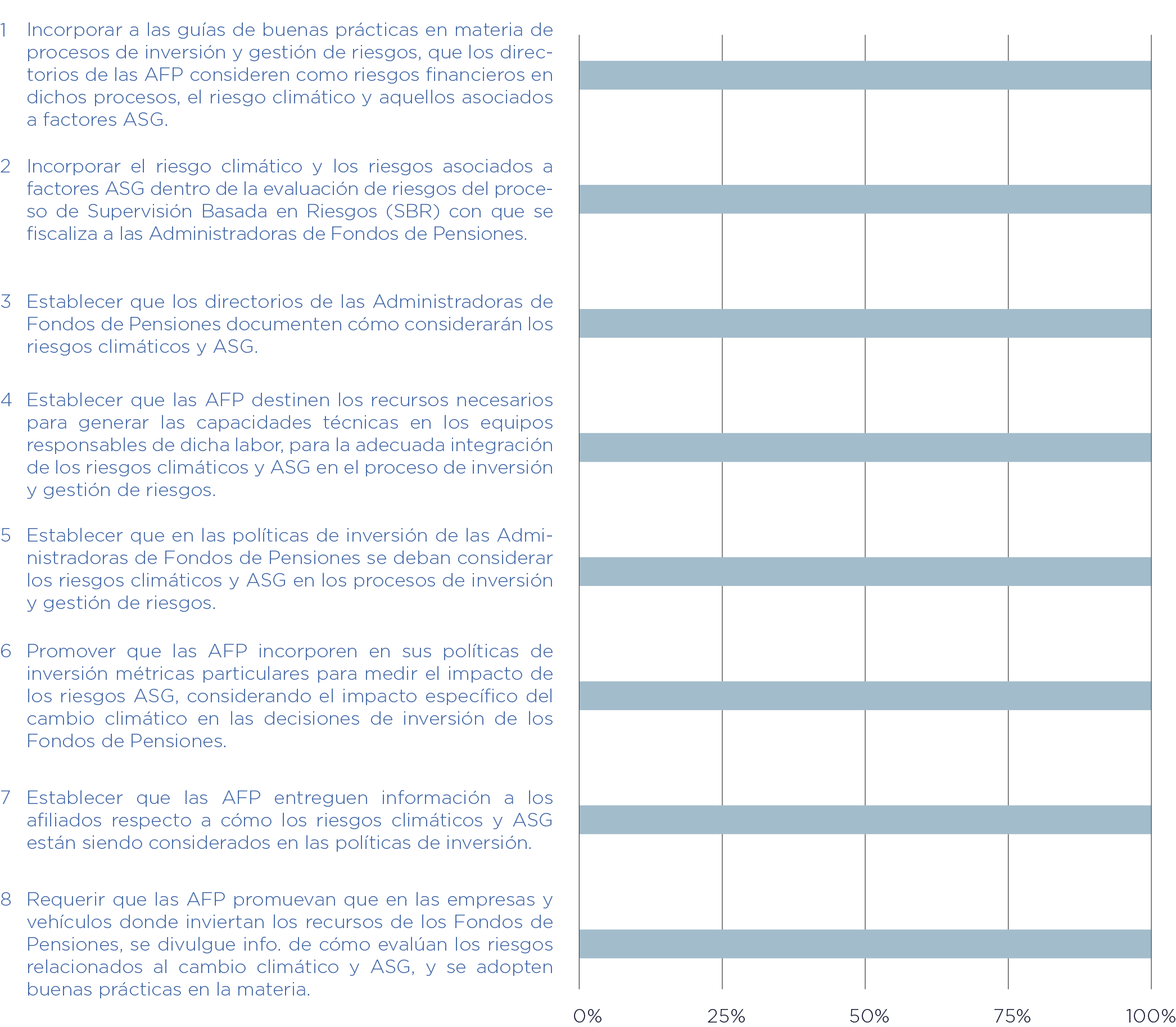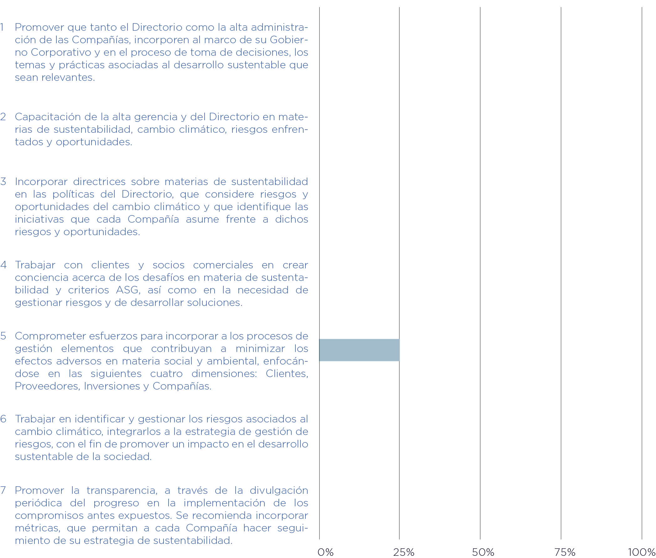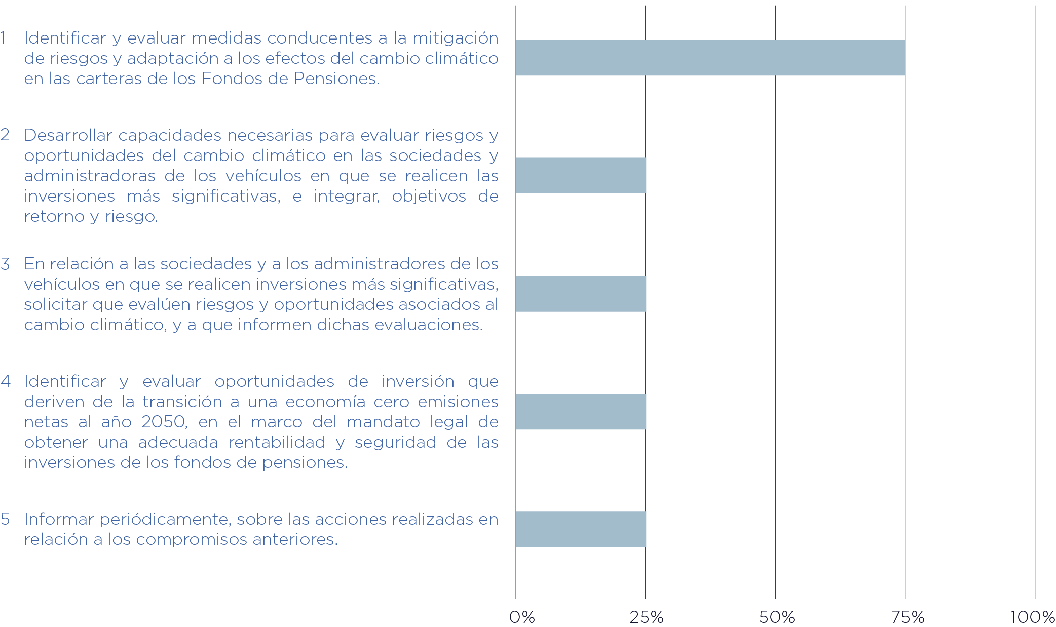 Las Administradoras de Fondos de Pensiones acordaron la ejecución de 5 compromisos y hasta la fecha se ha logrado un porcentaje de progreso total de un 35%. En el siguiente gráfico se puede encontrar el desglose para cada compromiso.