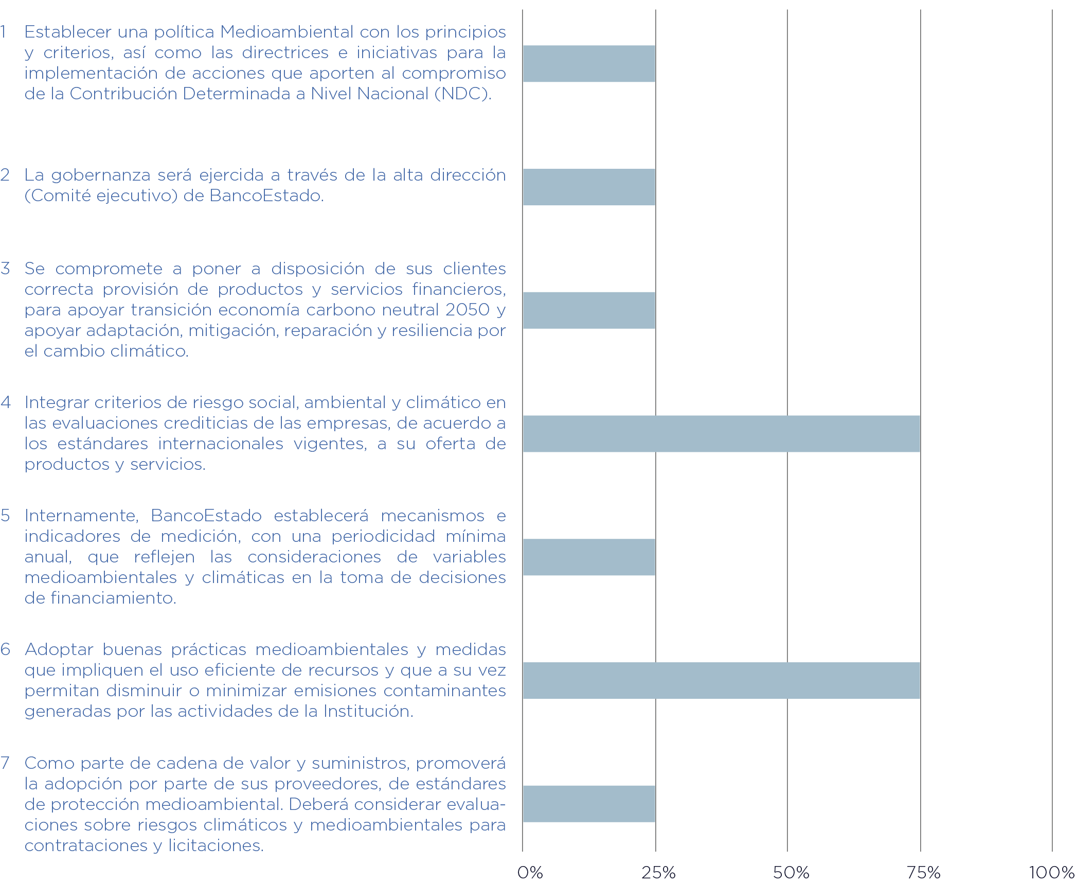 El Banco del Estado de Chile acordó el cumplimiento de 5 compromisos y hasta la fecha se ha logrado un porcentaje de progreso total de un 39% del total. En el siguiente gráfico se puede encontrar el desglose para cada compromiso.