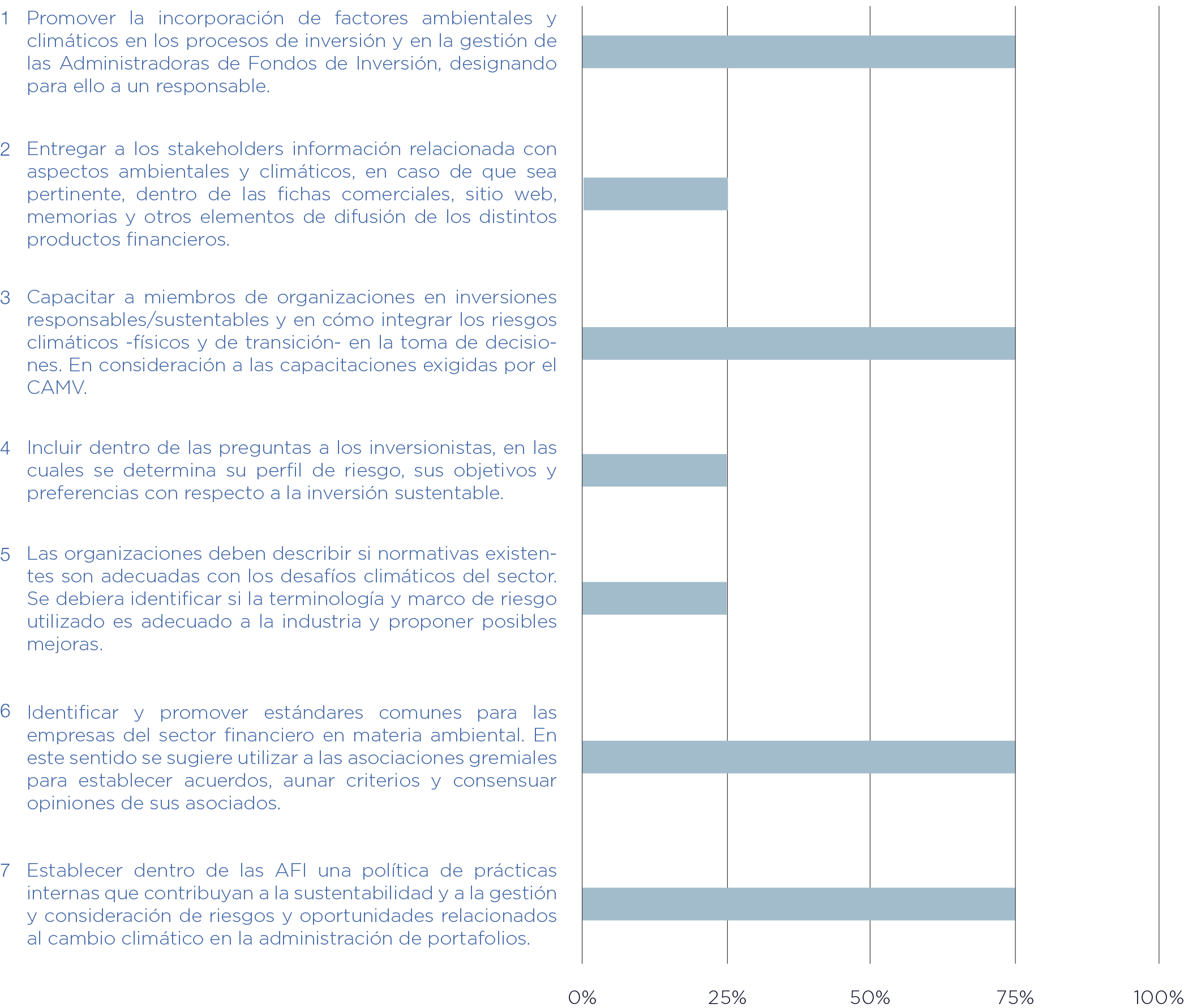 A las Administradoras de Fondos de Inversión le corresponden 7 compromisos y el porcentaje de progreso total para esta categoría con respecto a los compromisos adquiridos es de un 54% a la fecha. En el Gráfico Nº 13 se puede observar en detalle la situación actual de cada compromiso voluntario.